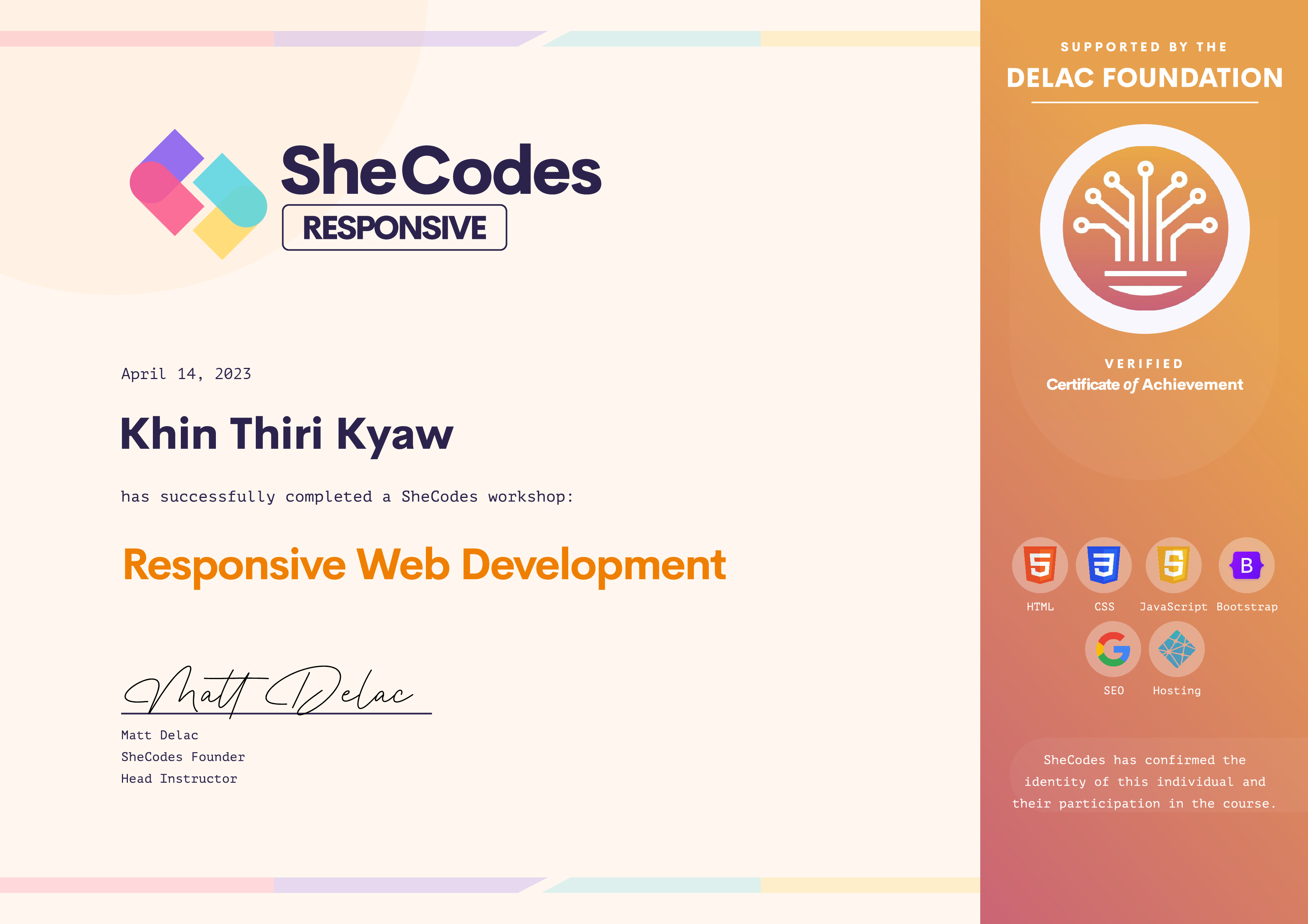 A SheCodes Verified Certificate indicates that the participant has successfully completed a SheCodes workshop, including all required assignments and affiliated tasks. It also signifies that the identity of the participant has been verified by SheCodes.