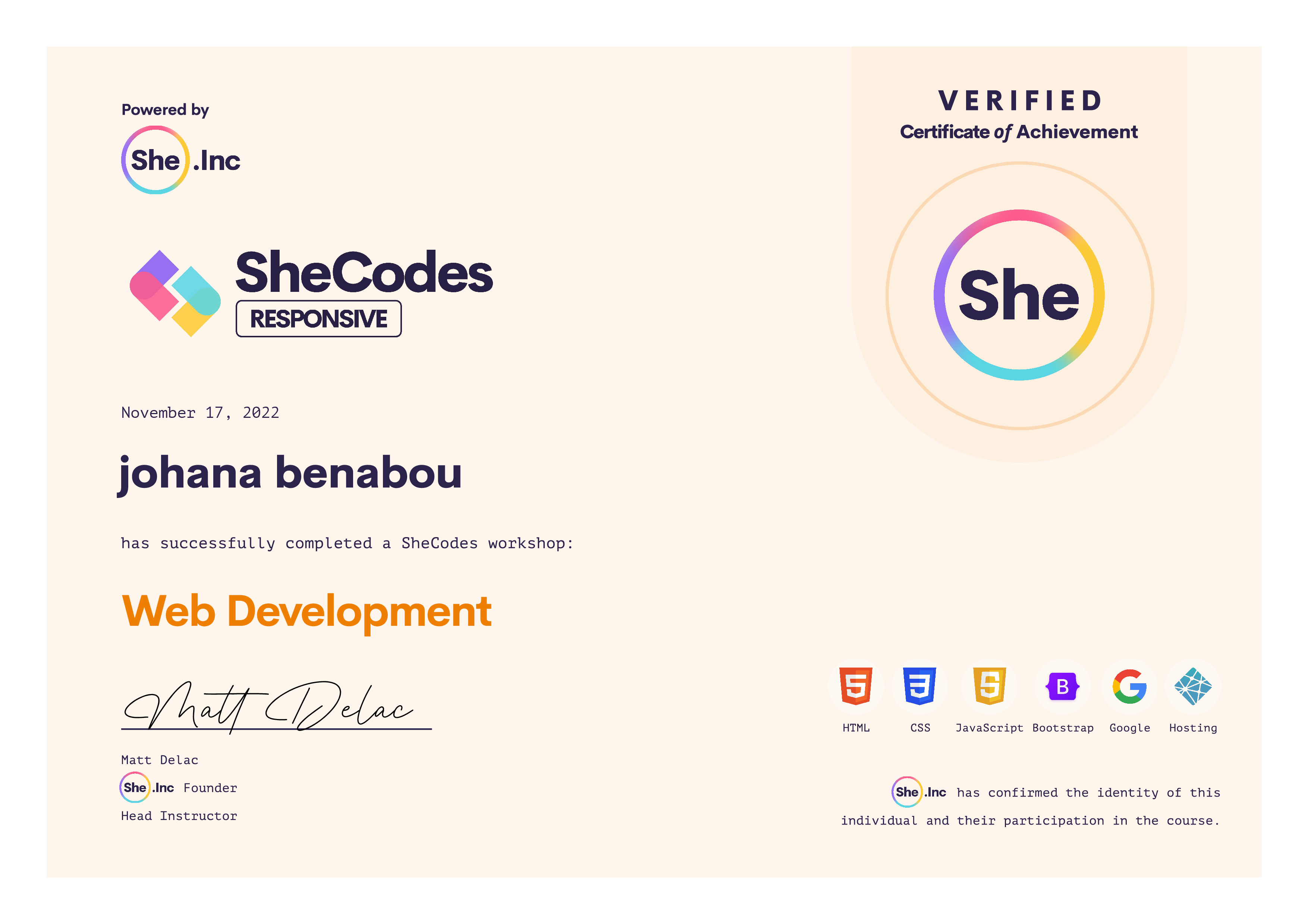 A SheCodes Verified Certificate indicates that the participant has successfully completed a SheCodes workshop, including all required assignments and affiliated tasks. It also signifies that the identity of the participant has been verified by SheCodes.