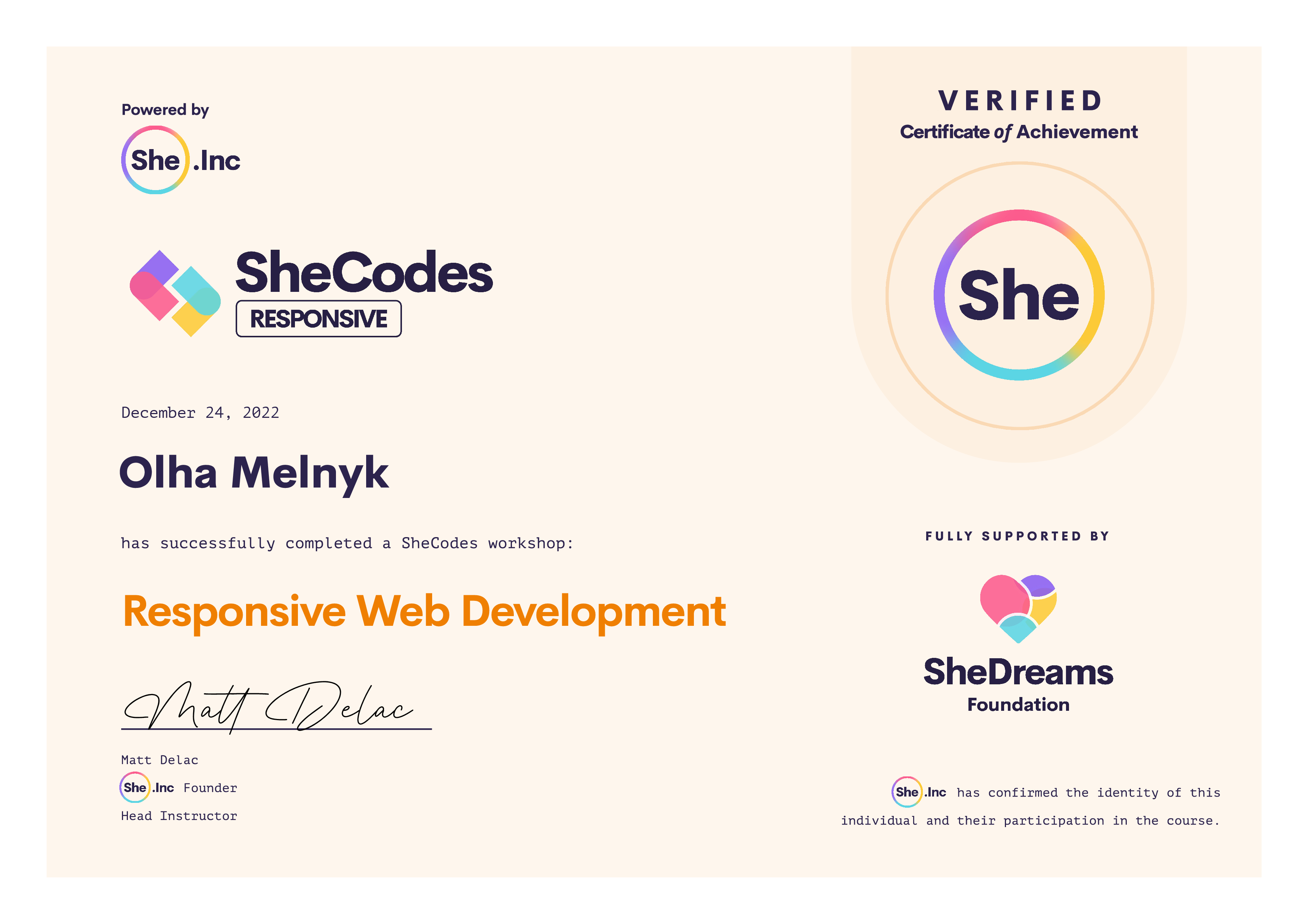 A SheCodes Verified Certificate indicates that the participant has successfully completed a SheCodes workshop, including all required assignments and affiliated tasks. It also signifies that the identity of the participant has been verified by SheCodes.