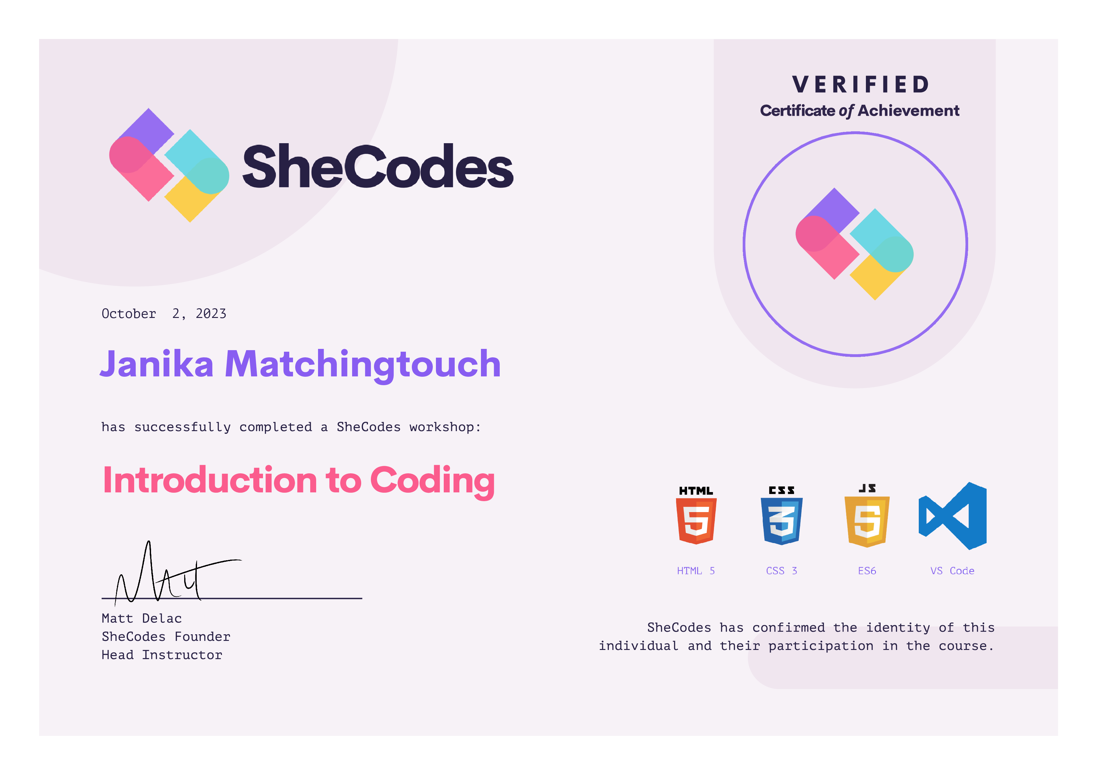 About SheCodes Verified Certificates