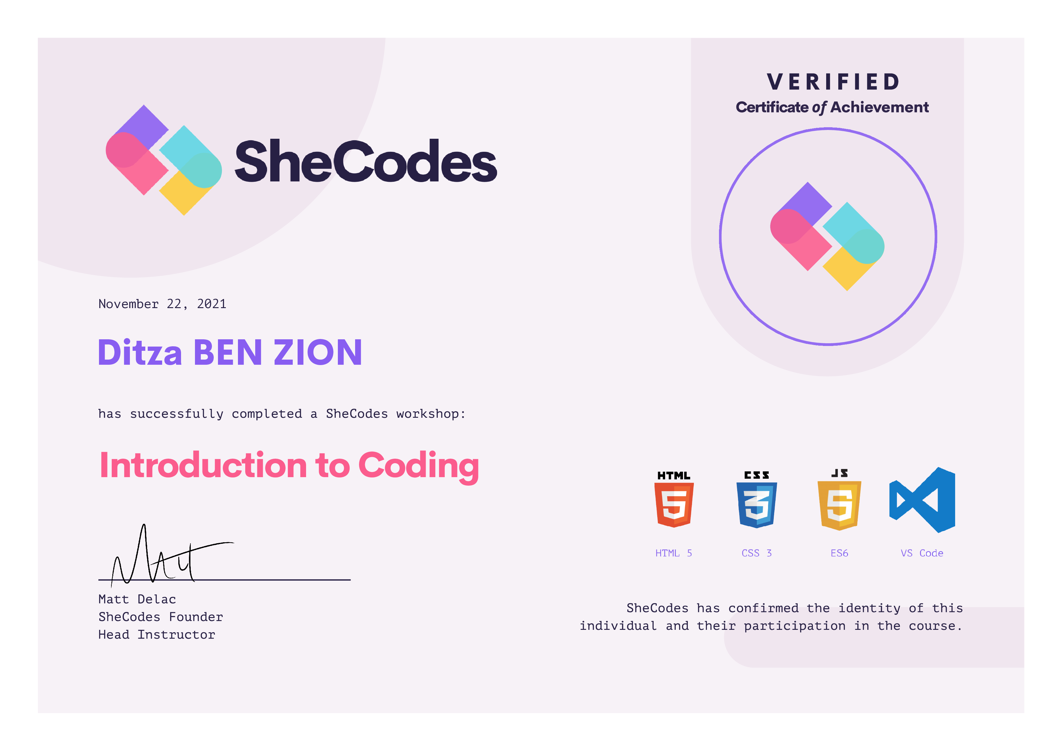 A SheCodes Verified Certificate indicates that the participant has successfully completed a SheCodes workshop, including all required assignments and affiliated tasks. It also signifies that the identity of the participant has been verified by SheCodes.