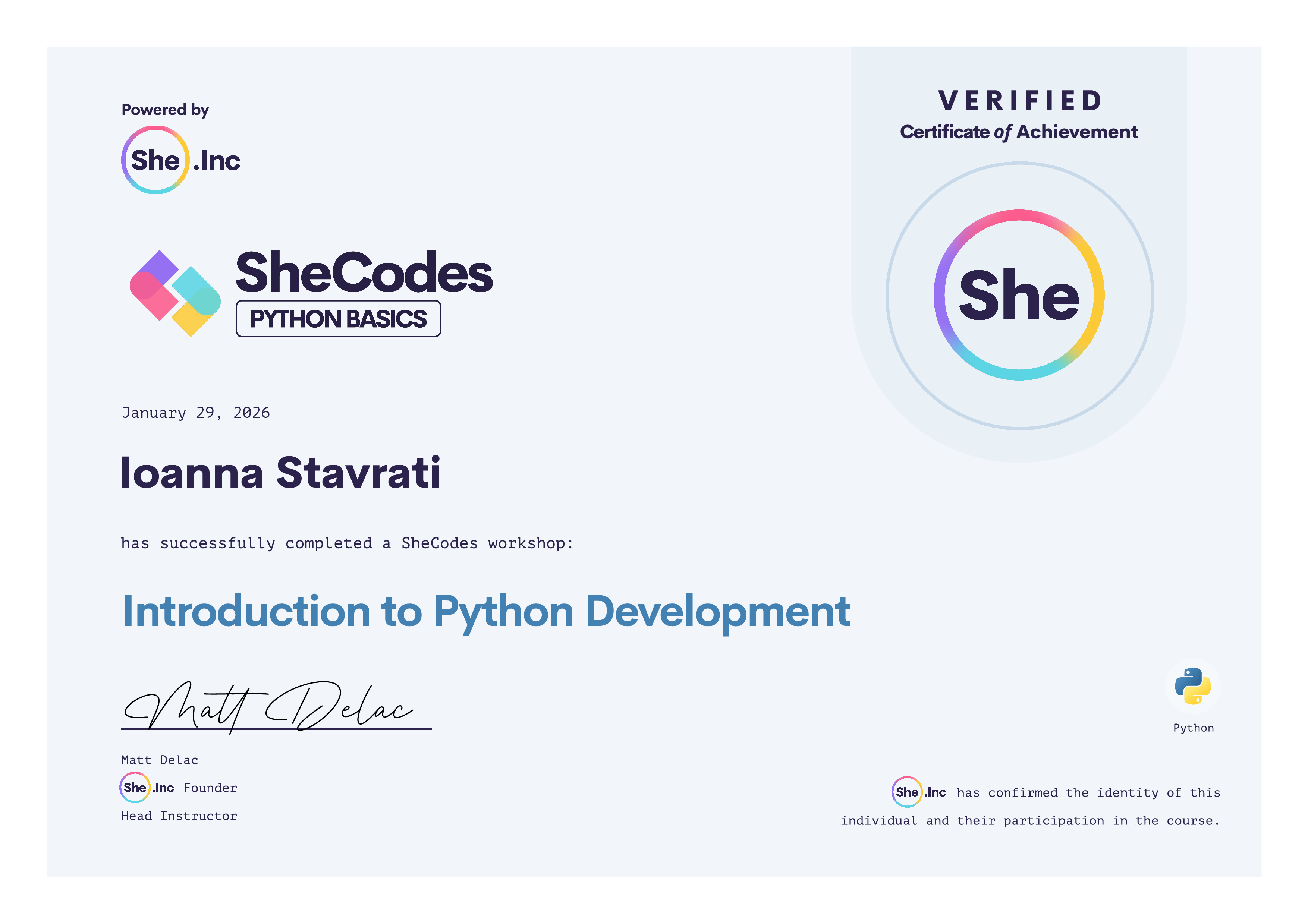 A SheCodes Verified Certificate indicates that the participant has successfully completed a SheCodes workshop, including all required assignments and affiliated tasks. It also signifies that the identity of the participant has been verified by SheCodes.