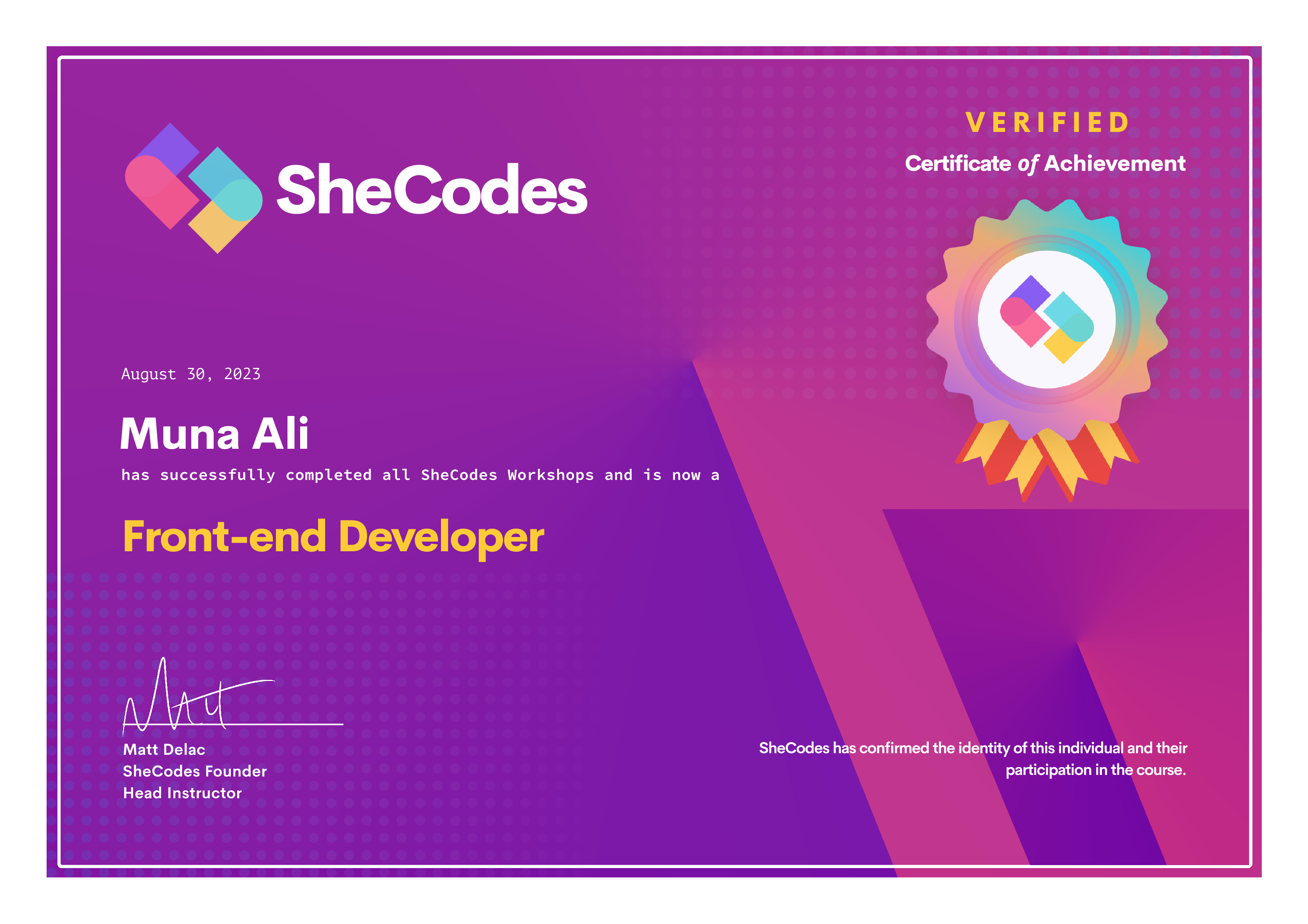 A SheCodes Verified Certificate indicates that the participant has successfully completed a SheCodes workshop, including all required assignments and affiliated tasks. It also signifies that the identity of the participant has been verified by SheCodes.