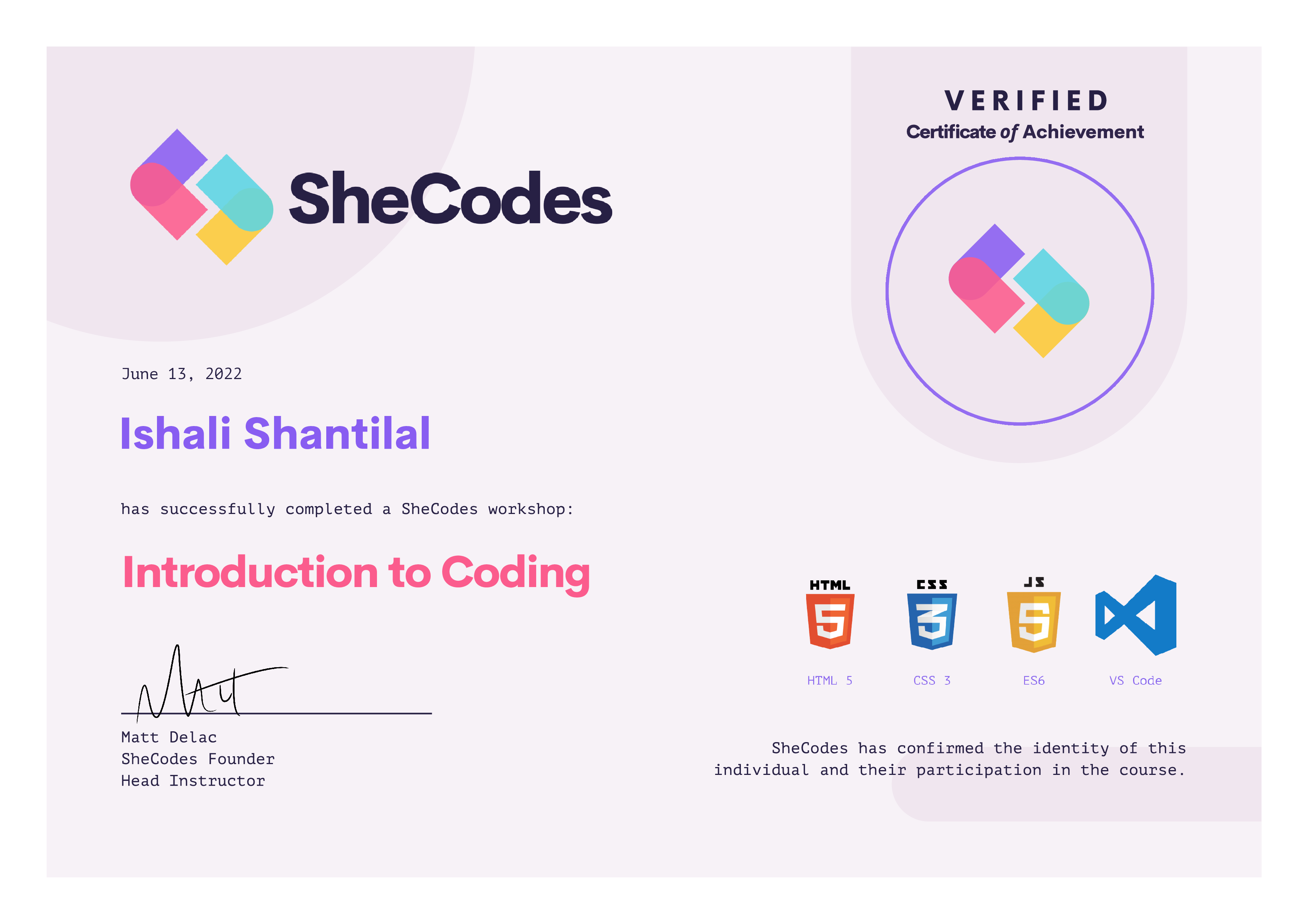 A SheCodes Verified Certificate indicates that the participant has successfully completed a SheCodes workshop, including all required assignments and affiliated tasks. It also signifies that the identity of the participant has been verified by SheCodes.