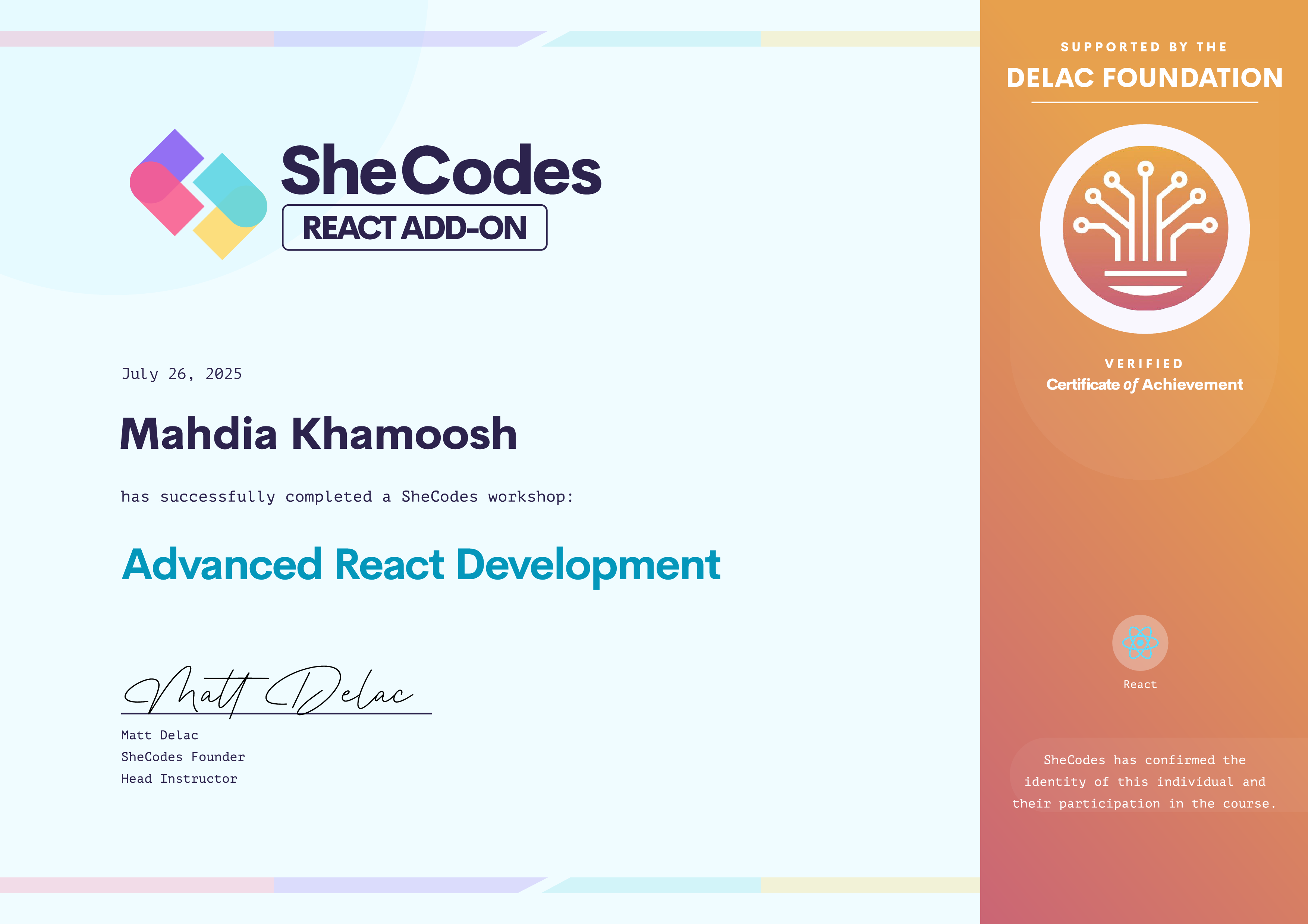 A SheCodes Verified Certificate indicates that the participant has successfully completed a SheCodes workshop, including all required assignments and affiliated tasks. It also signifies that the identity of the participant has been verified by SheCodes.