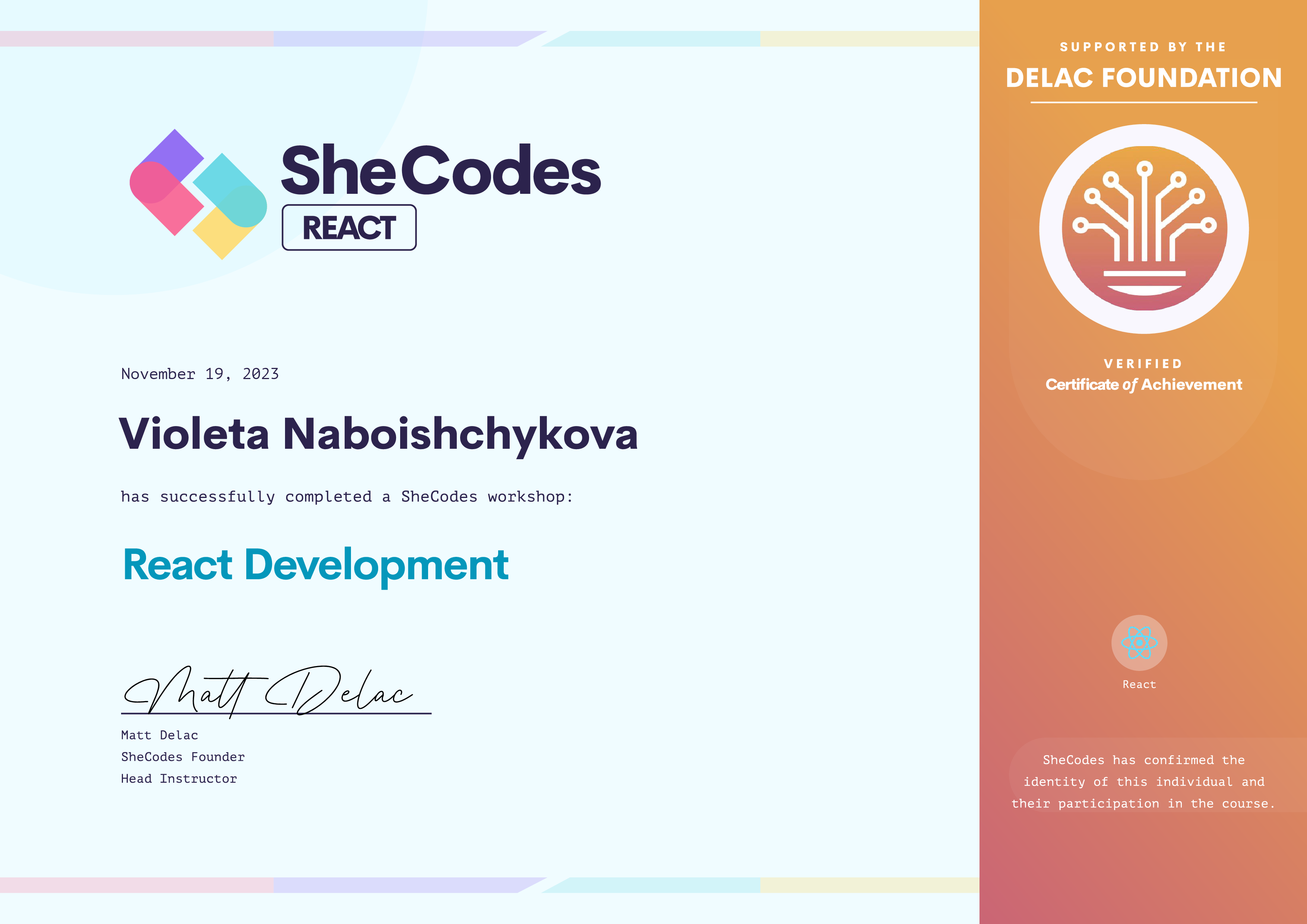 A SheCodes Verified Certificate indicates that the participant has successfully completed a SheCodes workshop, including all required assignments and affiliated tasks. It also signifies that the identity of the participant has been verified by SheCodes.