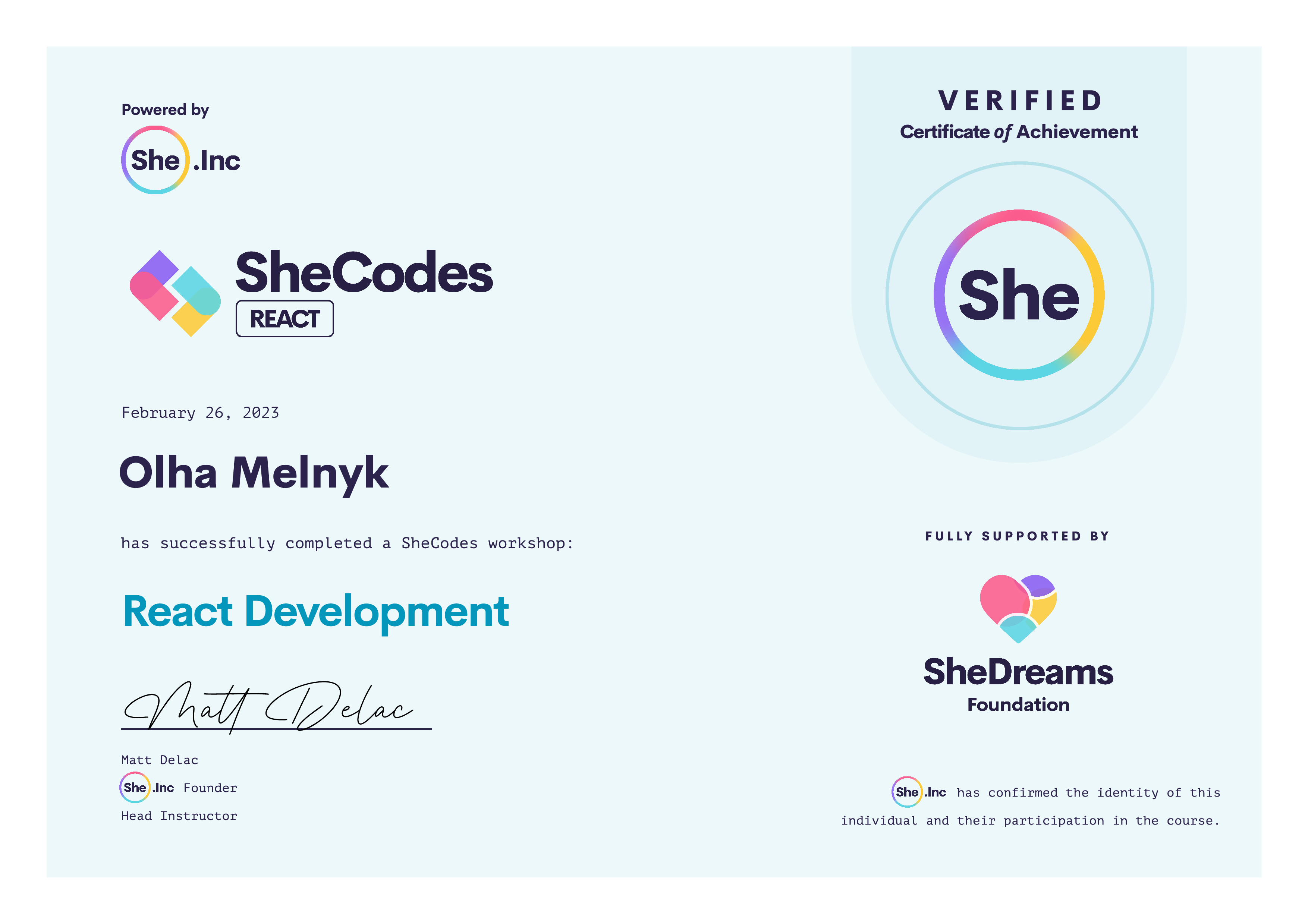 A SheCodes Verified Certificate indicates that the participant has successfully completed a SheCodes workshop, including all required assignments and affiliated tasks. It also signifies that the identity of the participant has been verified by SheCodes.