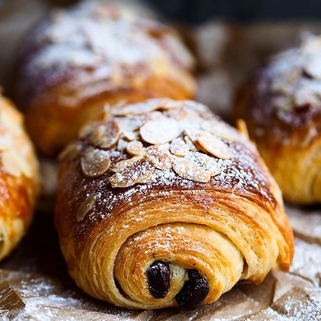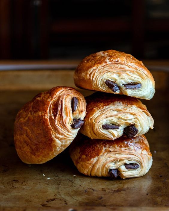 Pain au chocolat also known as chocolatine in the south-west part of France and in Canada, or couque au chocolat in Belgium, is a type of viennoiserie sweet pastry consisting of a cuboid-shaped piece of yeast-leavened laminated dough, similar in texture to a puff pastry, with one or two pieces of dark chocolate in the center. Check out these tasty photos.