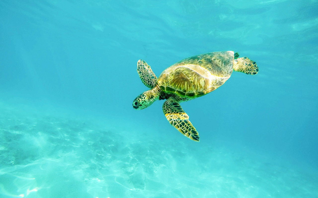 As reptiles, sea turtles breathe air, but they have the ability, under natural conditions, to remain submerged for hours at a time. They even sleep underwater. Most sea turtles spend their entire life at sea, only returning to nesting beaches to lay eggs. However, in the Pacific Islands, green turtles often come ashore to bask on the beach.