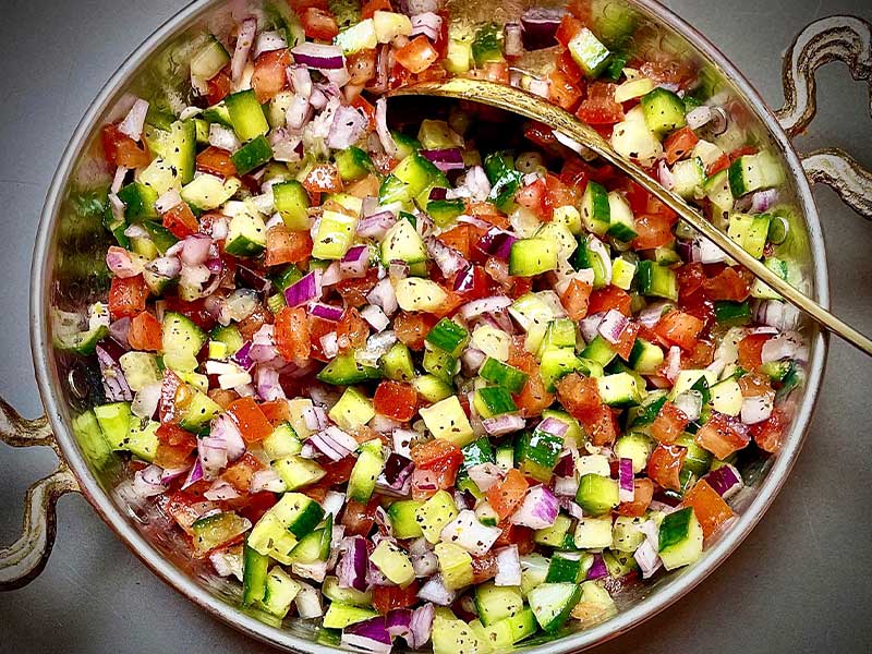 Side dishes or Starter are an important part of Iranian cuisine. Different types of salads, marinated vegetables, yogurt mixes, and other delicious Iranian side dishes give a Persian meal better taste. Combining the unique taste of Iranian main dishes with the salty, sour, or hot taste of their special side dishes is an interesting culinary experience. On the other hand, It’s not common to eat appetizers in Iran as the main dishes are often very large. Shirazi Salad or as we call it Salad Shirazi is one of the most popular Iranian Salads and is served with most Iranian dishes. it went viral in Tiktiok but alot of you guys may not know that this dish is actually and originally from Iran.
