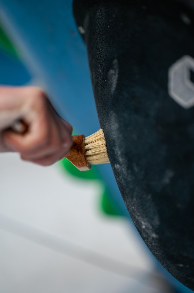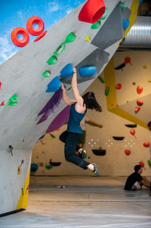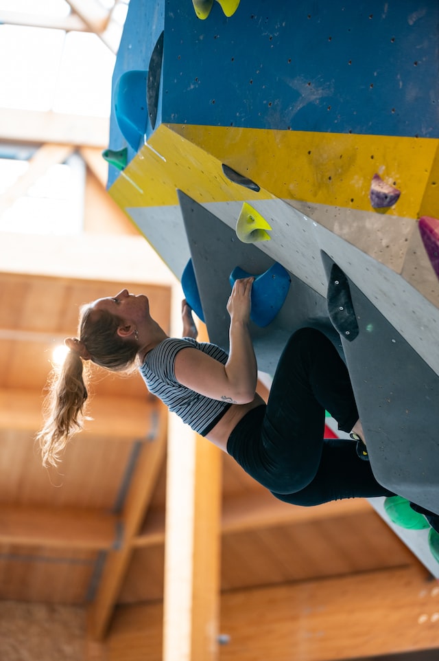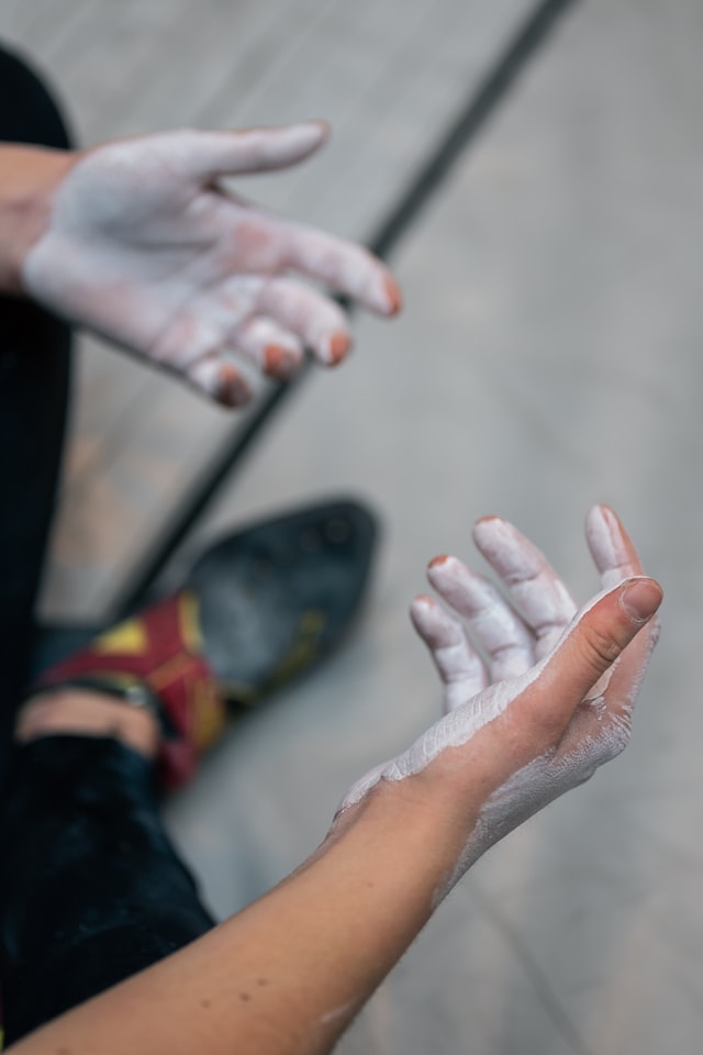 Bouldering is a form of free climbing that is performed on small rock formations or artificial rock walls without the use of ropes or harnesses. While bouldering can be done without any equipment, most climbers use climbing shoes to help secure footholds, chalk to keep their hands dry and to provide a firmer grip, and bouldering mats to prevent injuries from falls.