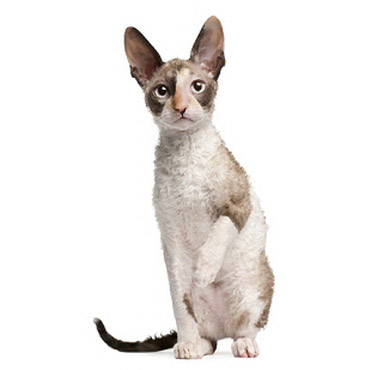 The Cornish Rex is a medium sized cat with large ears. The prominent feature of the breed however is their rex coat, which is curled and wavy, including the whiskers