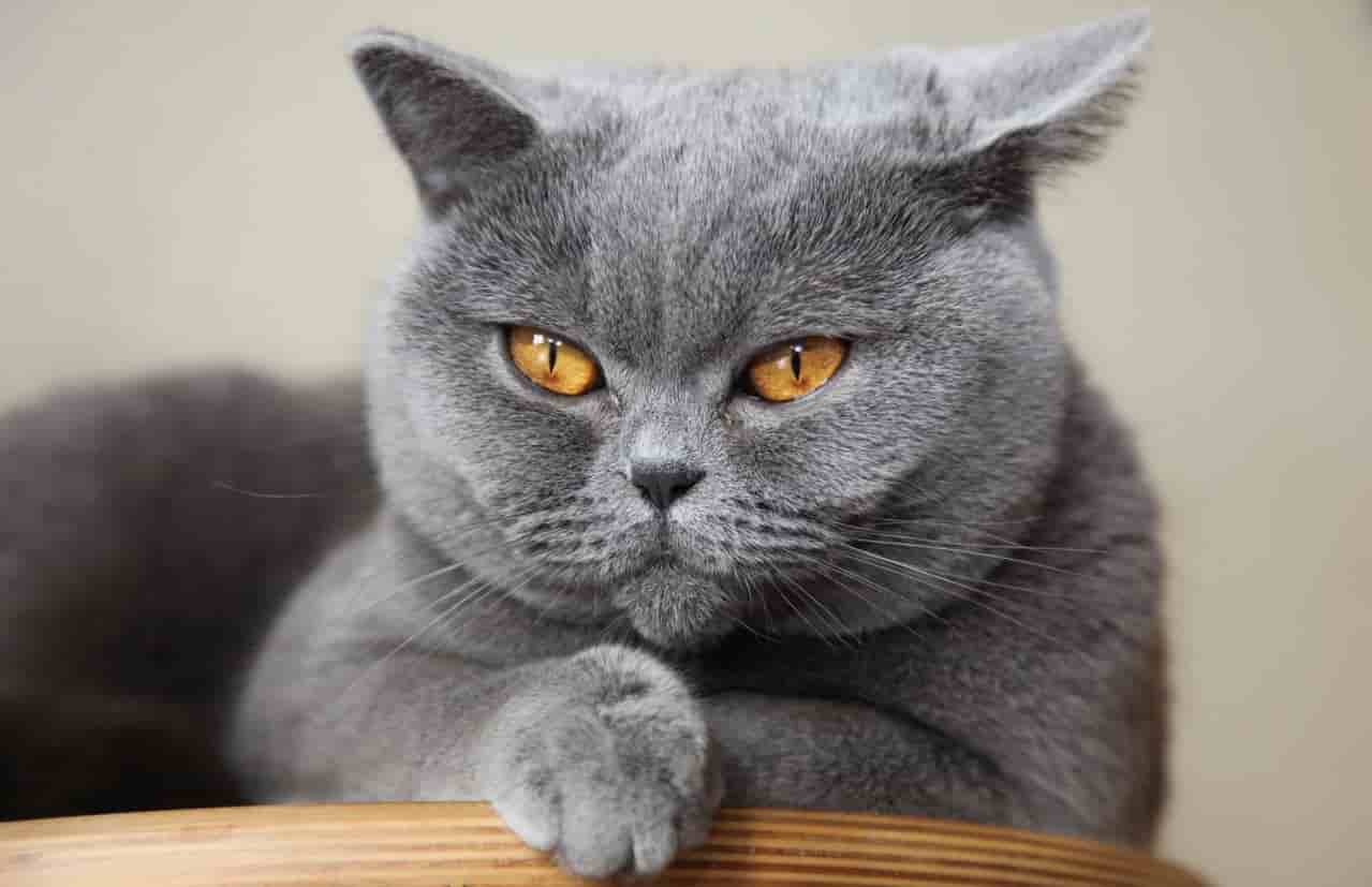 The British Shorthair is the pedigreed version of the traditional British domestic cat, with a distinctively stocky body, dense coat, and broad face. The most familiar colour variant is the "British Blue", with a solid grey-blue coat, orange eyes, and a medium-sized tail. The breed has also been developed in a wide range of other colours and patterns, including tabby and colourpoint.