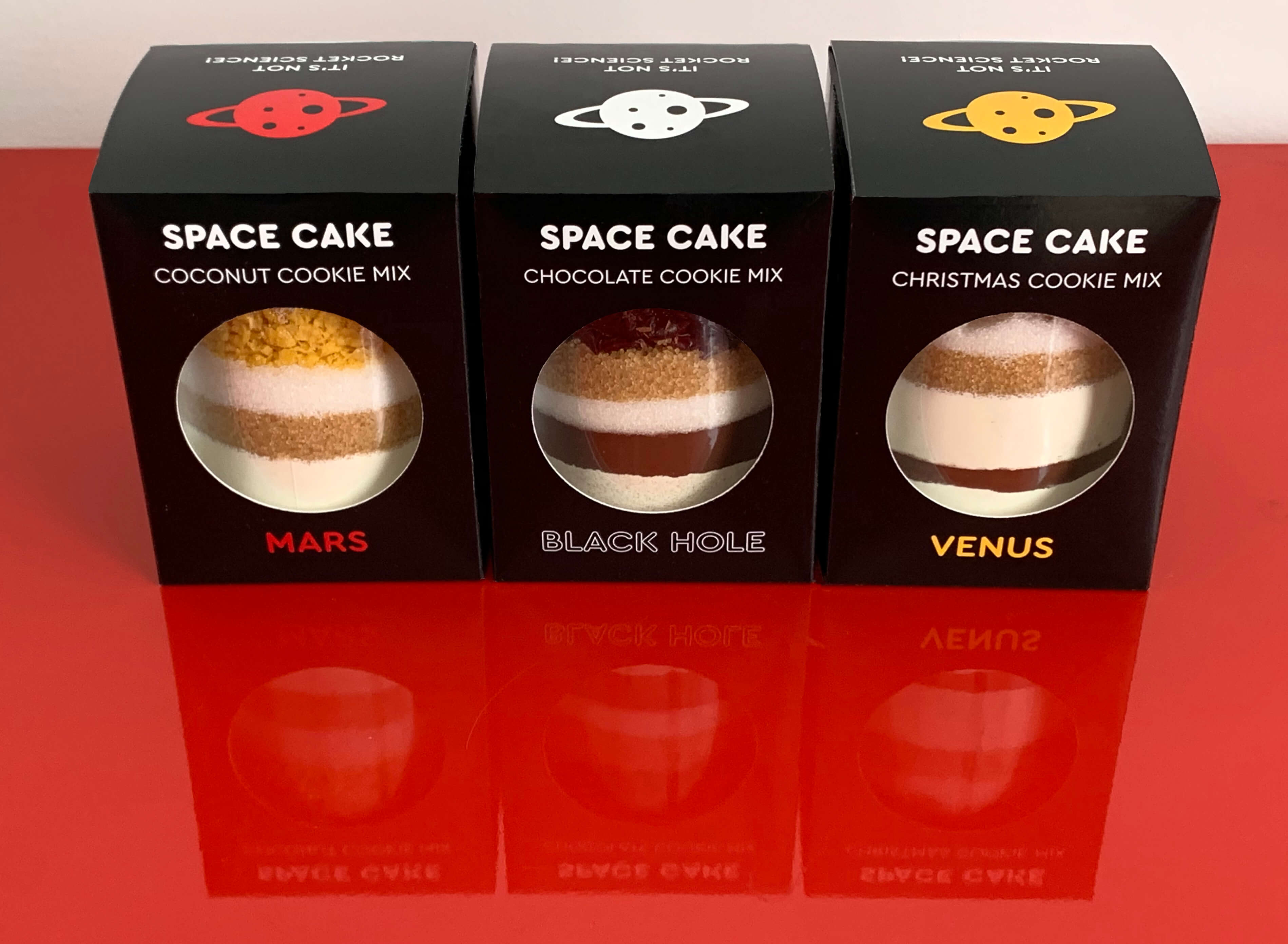 Baking has never been easier. There is no hassle with searching for a good recipe, buying all the ingredients and making a mess during the measurement. Space Cake brings you freshly baked homemade cookies in a fast and easy way. Simply add butter and an egg, mix it and bake it.