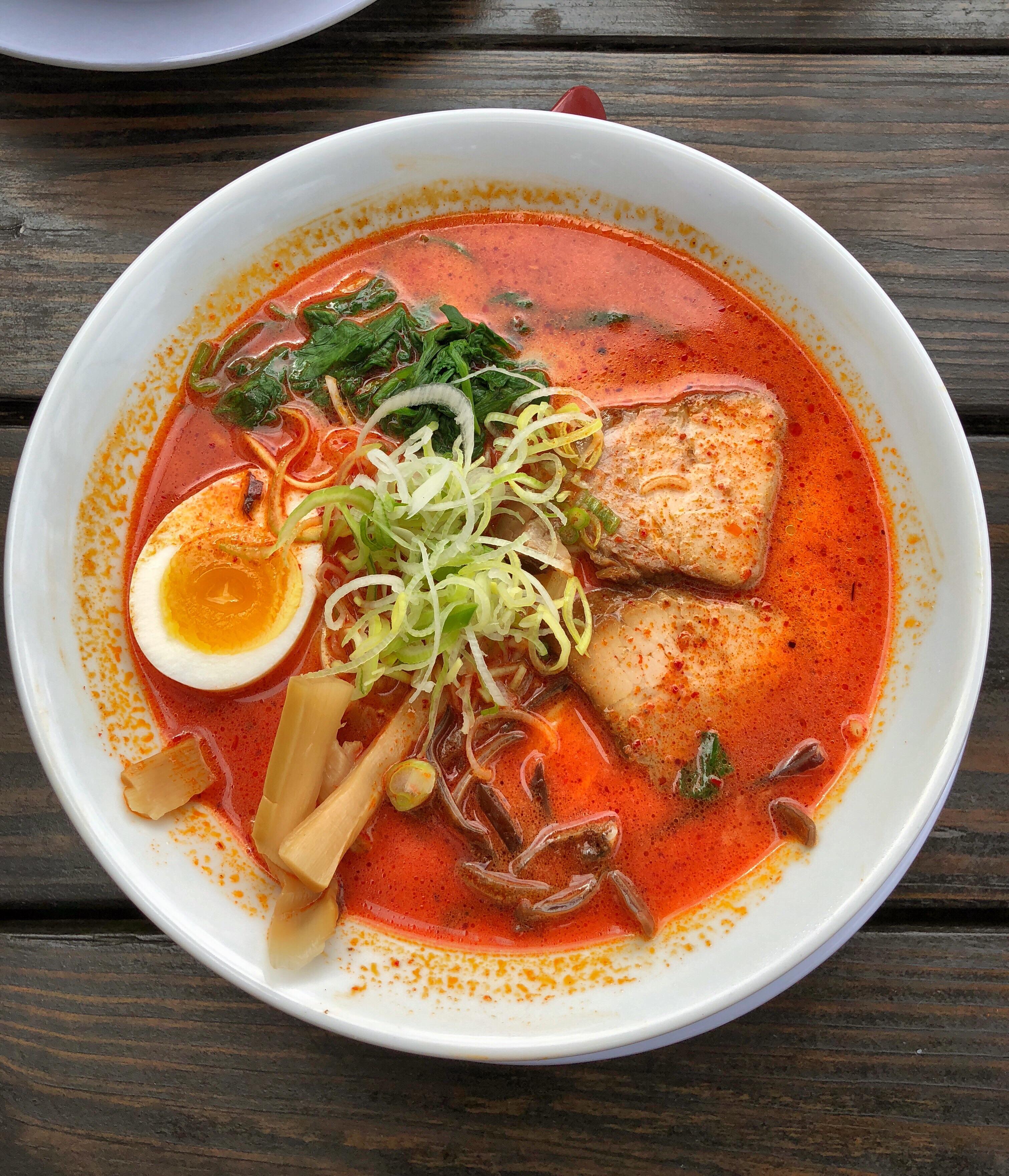 Tonkotsu ramen (θ±ιͺ¨γ©γΌγ‘γ³) is a ramen dish that originated in Fukuoka, Fukuoka Prefecture on the Kyushu island of Japan, and it is a speciality dish in both Fukuoka and Kyushu. The soup broth is based on pork bones and other ingredients, which are typically boiled for several hours, and the dish is traditionally topped with sliced pork belly and served with ramen noodles that are hard in the center. In Fukuoka, Japan, tonkotsu ramen is referred to as Hakata ramen.