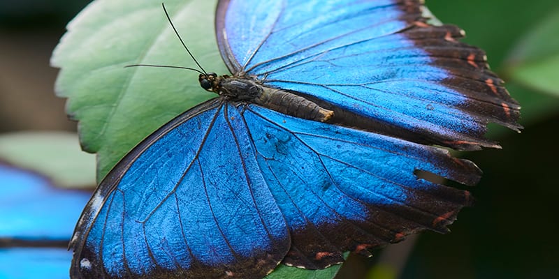 The Morpho Butterfly has wings that, to the human eye, appear an irredescent shade of blue. Descriptors of this butterfly note "their vivid, irredescent blue coloring is a result of the microscopic scales on the backs of their wings, which reflect light." Morpho butterflies are known to be of the largest butterflies in the world, with "wings spanning from five to eight inches". Though butterflies have a known lifespan of approximately 2-4 weeks, to behold a morpho butterfly within your own lifetime is undoubtedly an extraordinary treat.