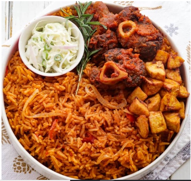 Although considerable variation exists, the basic profile for Nigerian jollof rice includes long-grain parboiled rice, tomatoes and tomato paste, pepper, vegetable oil, onions, and stock cubes. Most of the ingredients are cooked in one pot, of which a rich meat stock and a fried tomato and pepper puree characteristically forms the base. Rice is then added and left to cook in the liquid. The dish is then served with the protein of choice and very often with fried plantains, moi moi, steamed vegetables, coleslaw, salad, etc. In the riverine areas of Nigeria where seafood is the main source of protein, seafood often takes the place of chicken or meat as the protein of choice.