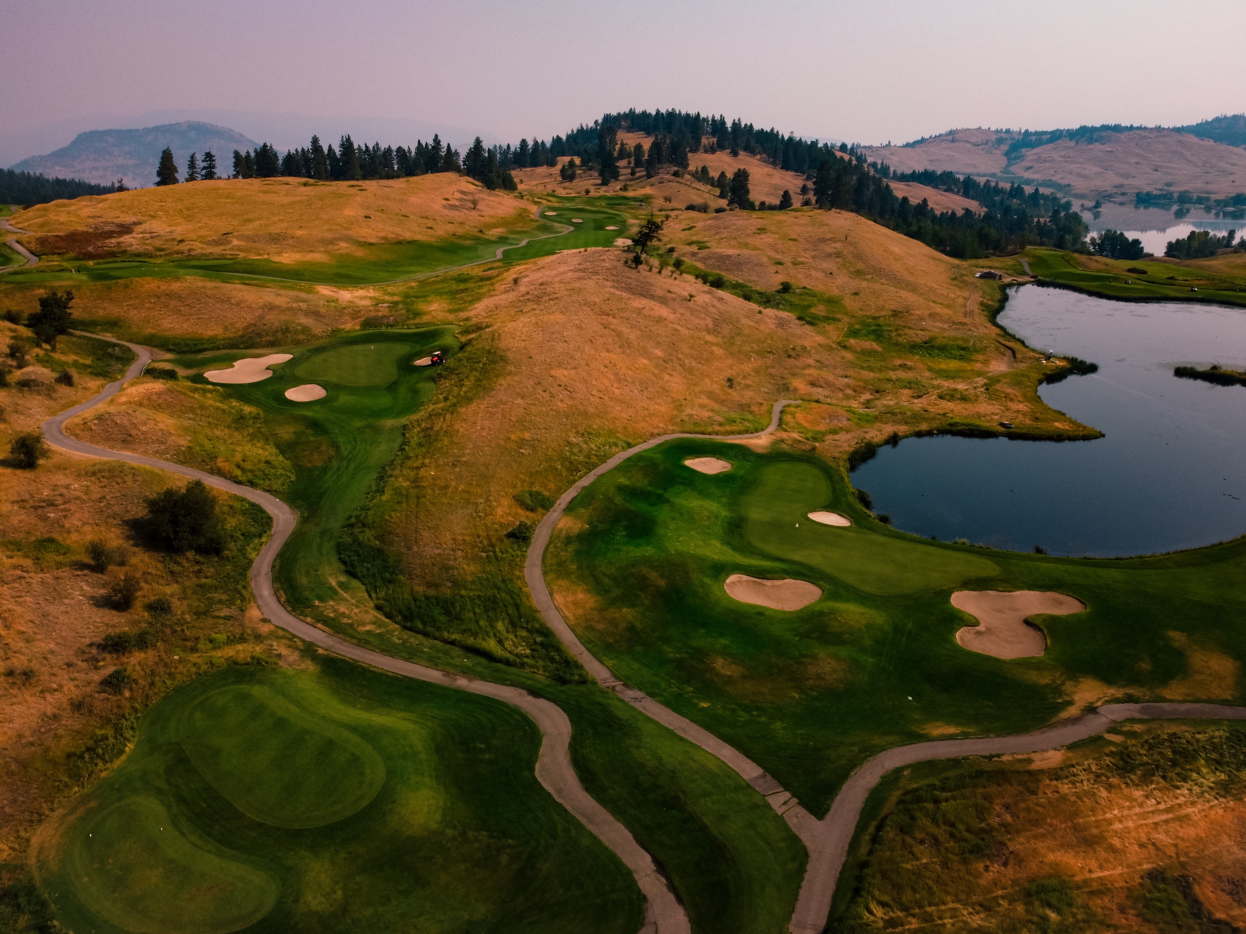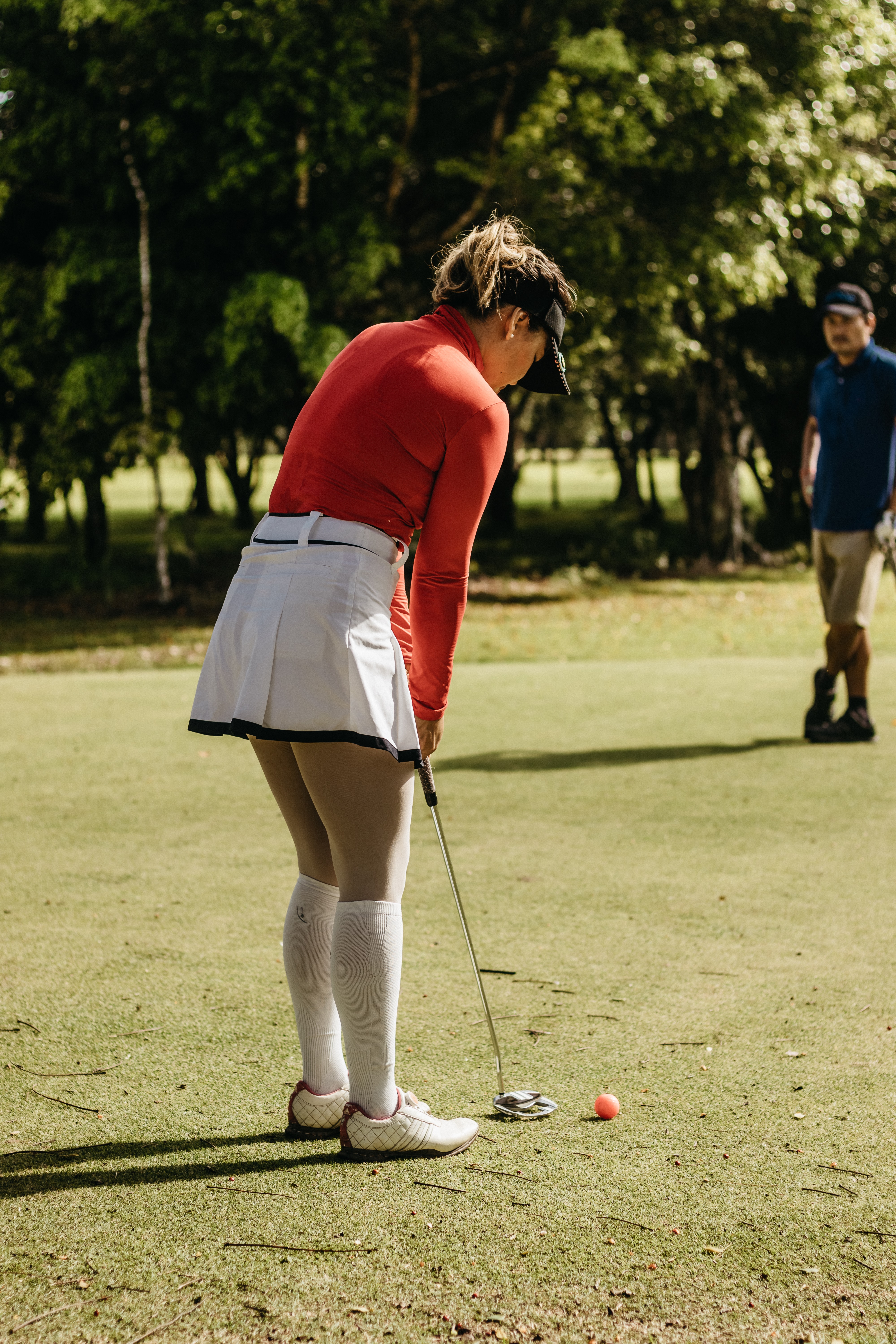 is played on an outdoor 18-hole course with a tee box, fairway, rough,