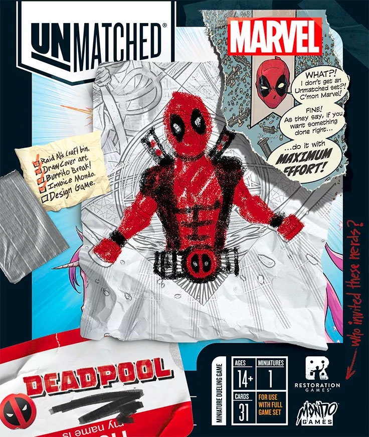 Deadpool is a single-hero expansion to be used with any existing Unmatched full set. It includes a hero miniature, a health dial, and 31 cards.