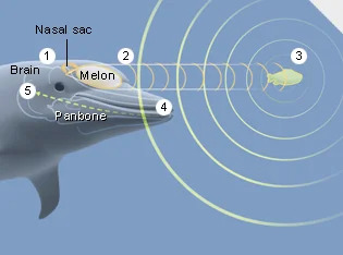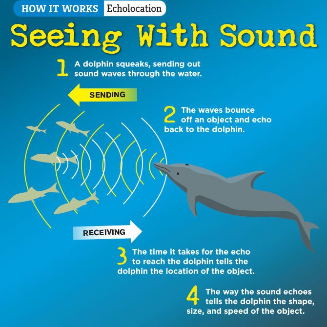 1. The dolphin creates clicks in its nasal sac. 2. A round organ called the melon focuses the sound beam. 3. The sound strikes an object and returns toward the dolphin. 4. The panbone in the dolphin’s jaw receives the echo; fatty tissue behind it transmits the sound to the middle ear and from there to the brain. 5. Continuously transmitting and receiving clicks, the dolphin reacts to the time lapse and strength of the signal to judge distance and home in on an object. 1. SENDING: A dolphin squeaks, sending out sound waves through the water. 2. The waves bounce off an object and echo back to the dolphin. 3. RECIEVING: The time it takes for the echo to reach the dolphin tells the dolphin the location of the object. 4. The way the sound echoes tells the dolphin the shape,size,and speed of the object.