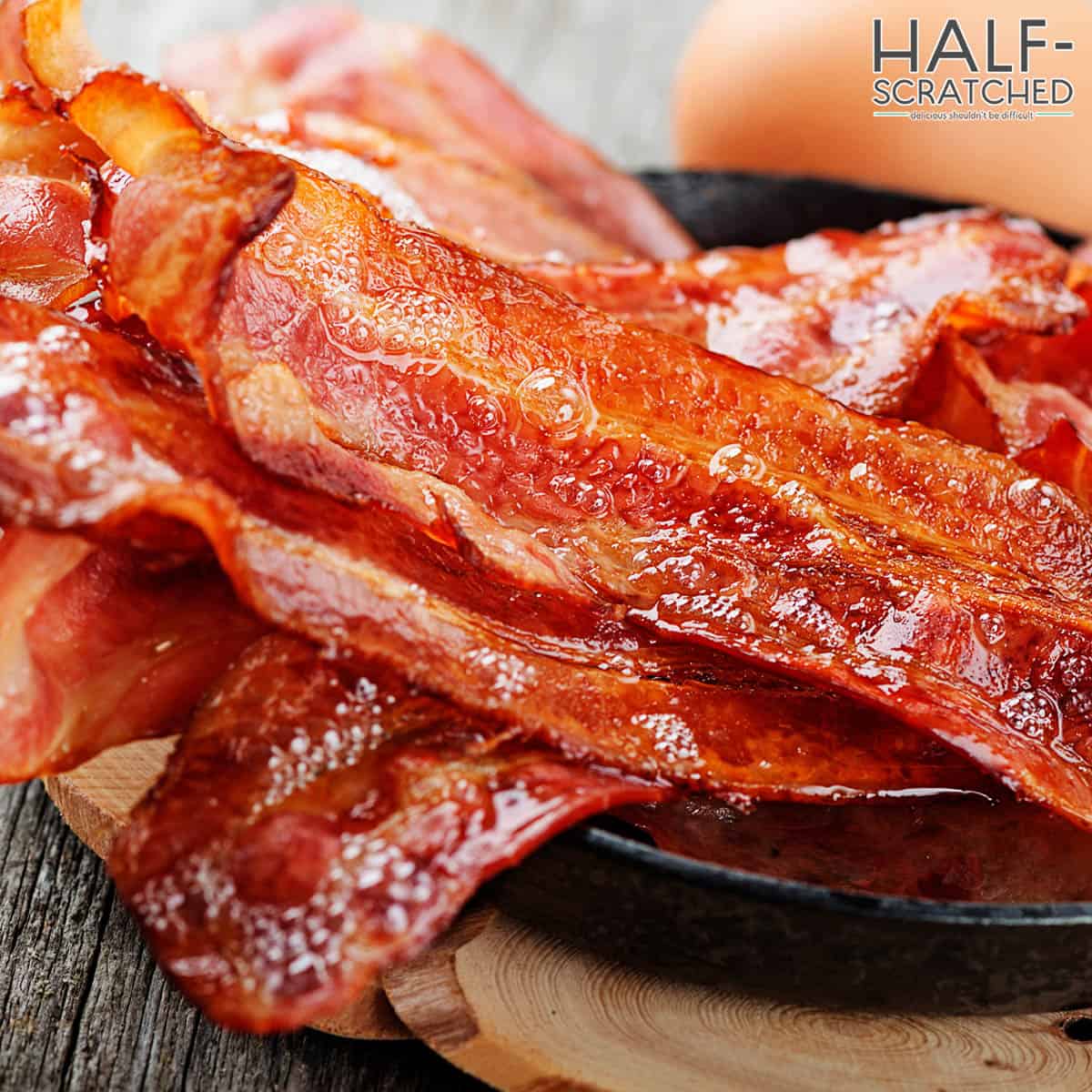 Bacon is a type of salt-cured pork made from various cuts, typically the belly or less fatty parts of the back. It is eaten as a side dish (particularly in breakfasts), used as a central ingredient (e.g., the bacon, lettuce, and tomato sandwich (BLT)), or as a flavouring or accent (as in bacon bits in a salad). Vegetarian bacons such as "soy bacon" also exist.