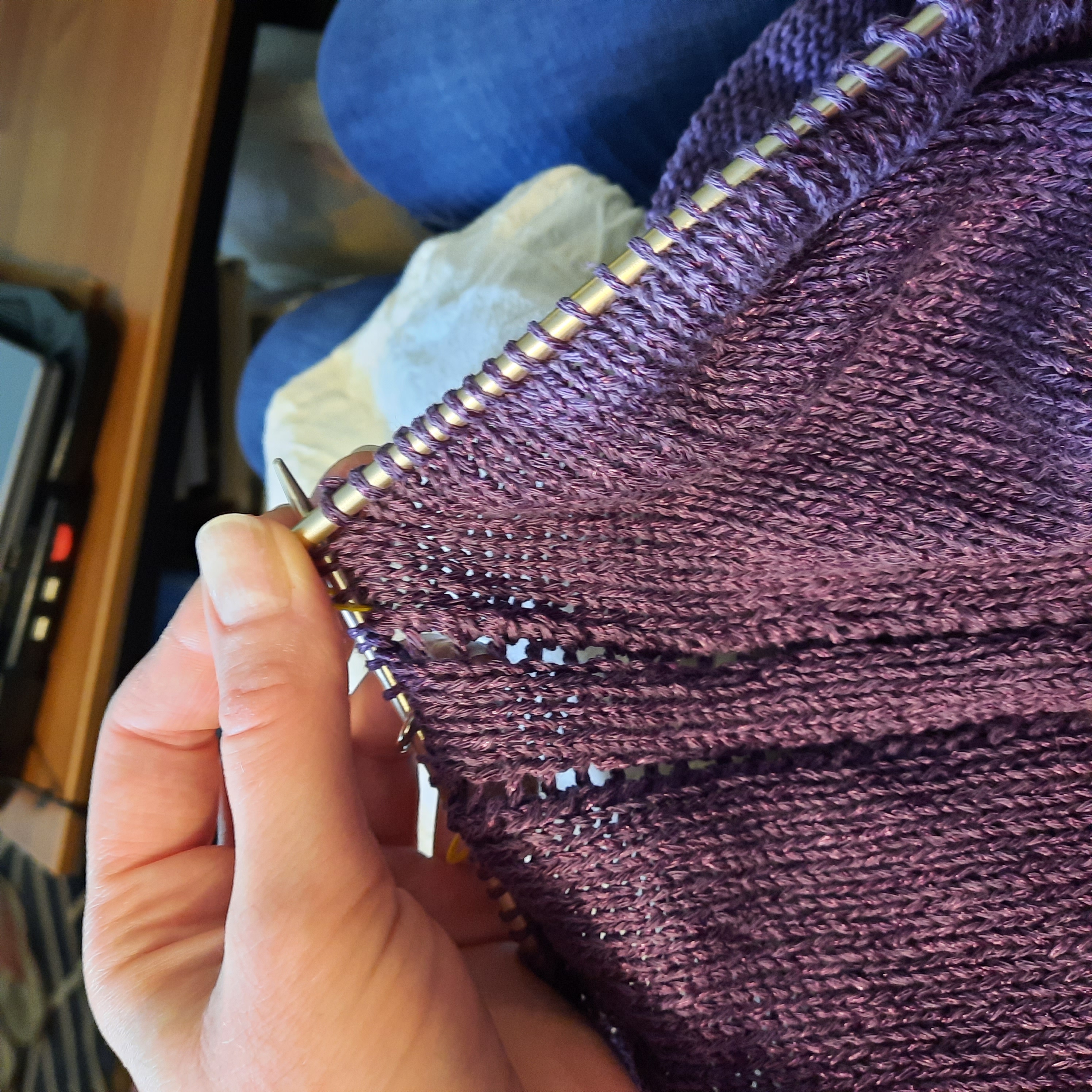 Knitting is a method for production of textile fabrics by interlacing yarn loops with loops of the same or other yarns. It is used to create many types of garments. Knitting may be done by hand or by machine. Knitting creates stitches: loops of yarn in a row, either flat or in the round (tubular). There are usually many active stitches on the knitting needle at one time. Knitted fabric consists of a number of consecutive rows of connected loops that intermesh with the next and previous rows. As each row is formed, each newly created loop is pulled through one or more loops from the prior row and placed on the gaining needle so that the loops from the prior row can be pulled off the other needle without unraveling.