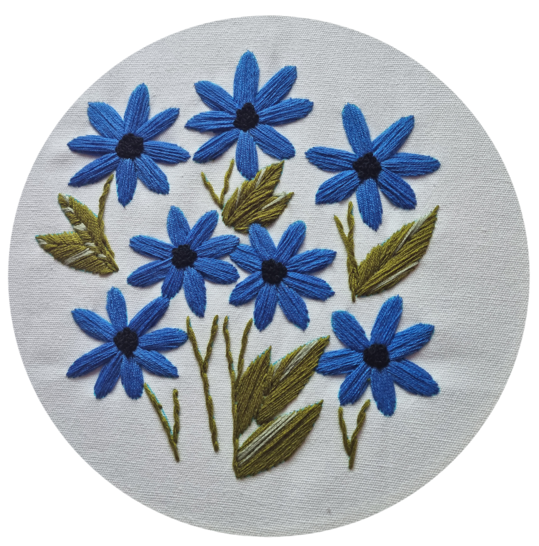 buttonhole or blanket stitch, running stitch, satin stitch, and cross