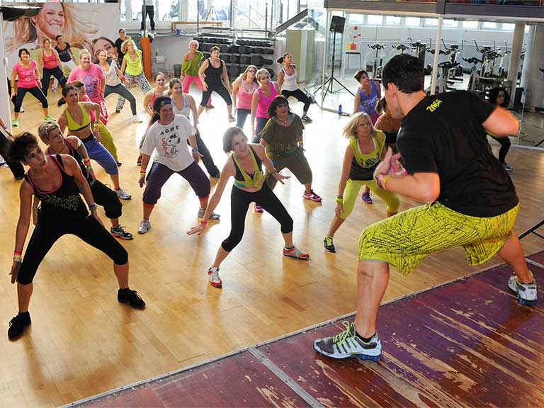 Zumba is an aerobic fitness program featuring movements inspired by various styles of Latin American dance and performed primarily to Latin American dance music. Check out their website