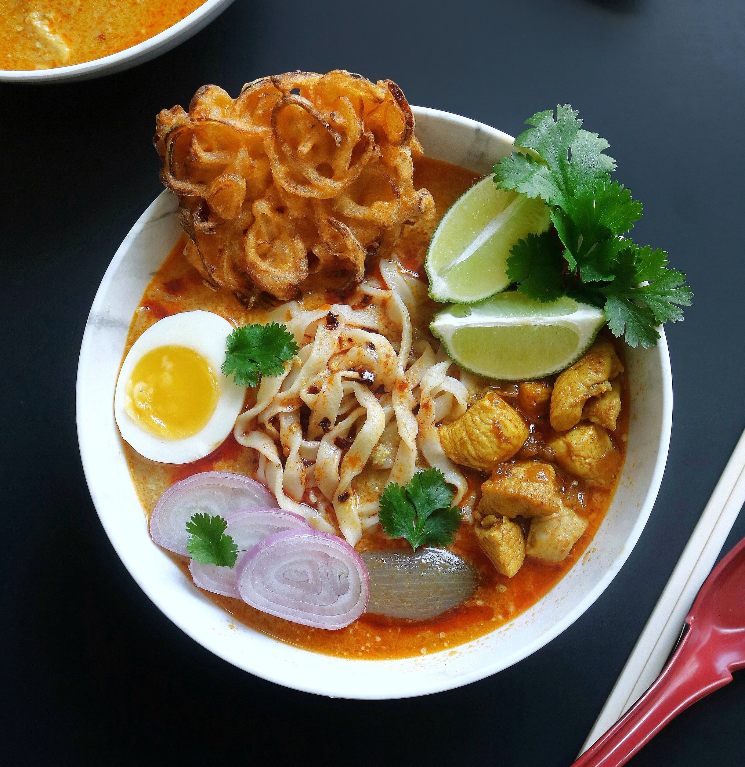 Ohn no khao swè is a Burmese dish consisting of wheat noodles in a curried chicken and coconut milk broth thickened with gram flour. The dish is often garnished with crisp fried bean fritters, sliced raw onions, chillies, crisp noodles, and slices of hard-boiled egg, and zested with lime or lemon juice and fish sauce.