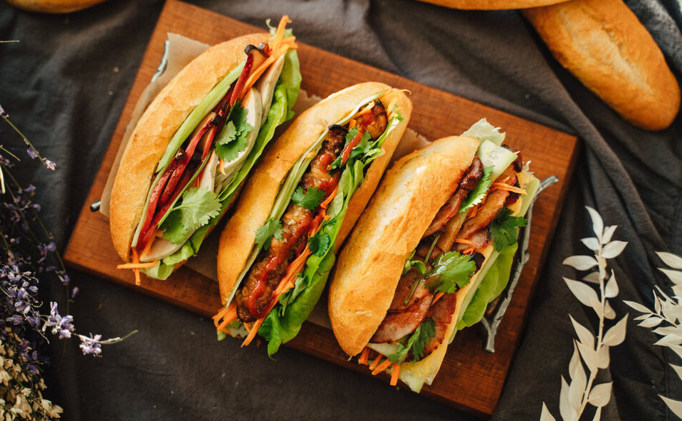 Banh mi is a short baguette with thin, crisp crust and soft, airy texture. It is often split lengthwise and filled with savory ingredients like a submarine sandwich and served as a meal.