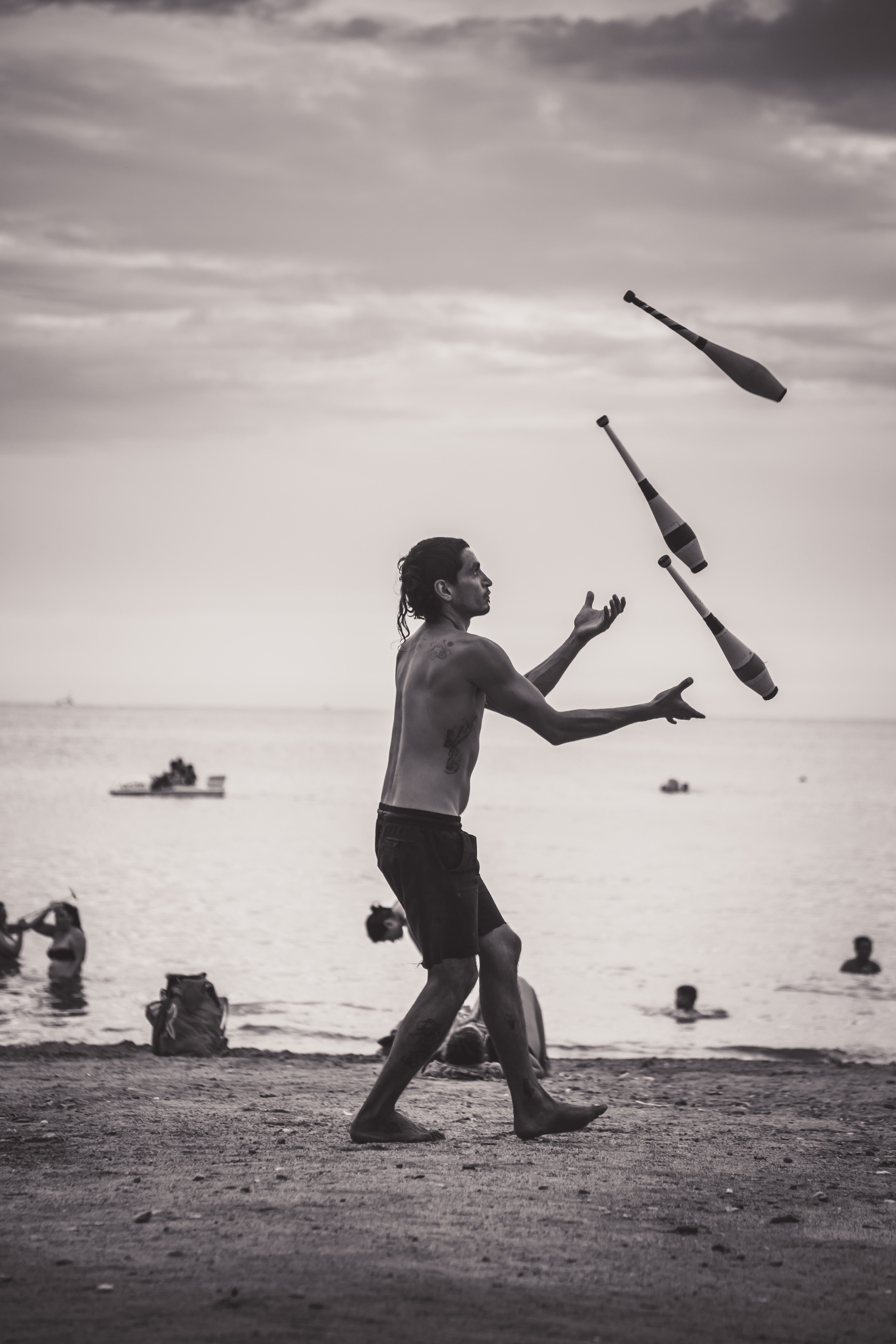 Juggling is a physical skill, performed by a juggler, involving the manipulation of objects for recreation, entertainment, art or sport. The most recognizable form of juggling is toss juggling. Juggling can be the manipulation of one object or many objects at the same time, most often using one or two hands but also possible with feet. Jugglers often refer to the objects they juggle as props.