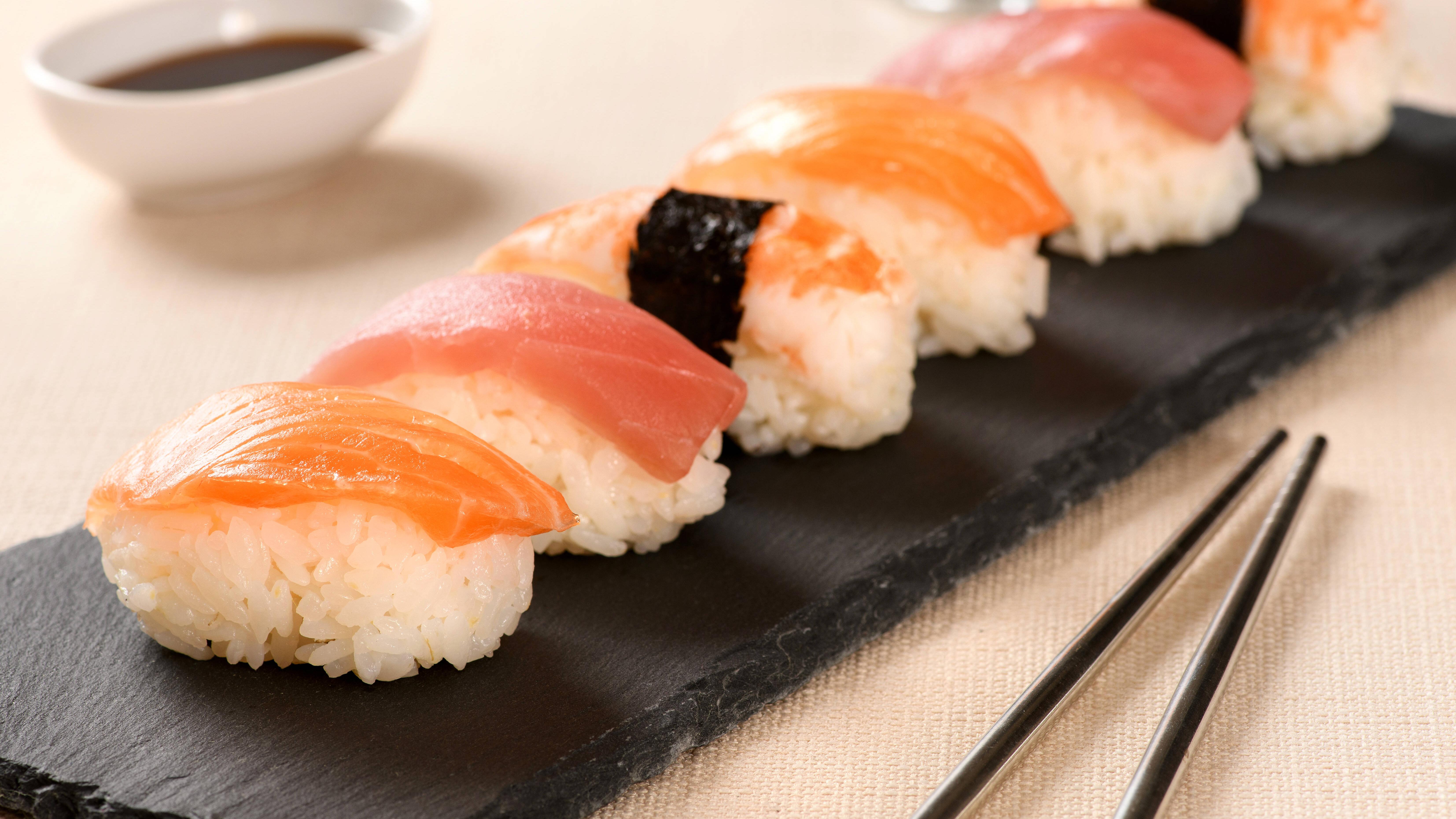 Nigiri is a type of sushi consisting of a small ball of rice topped with wasabi sauce and raw fish or other seafood. In Japanese, the term nigiri ni-giri means "two fingers." This refers to the typical bite-sized portion of rice that sushi artists use in assembling the dish. The act of "nigiru" means to grasp the rice form of sliced fresh fish with your hands. Nigiri sushi is recognizable as an oval-shaped mound of rice with a thin slice of fish, usually raw, placed on top of the grains. The simple presentation makes it a user-friendly starter for someone who is new to Japanese cuisine.