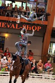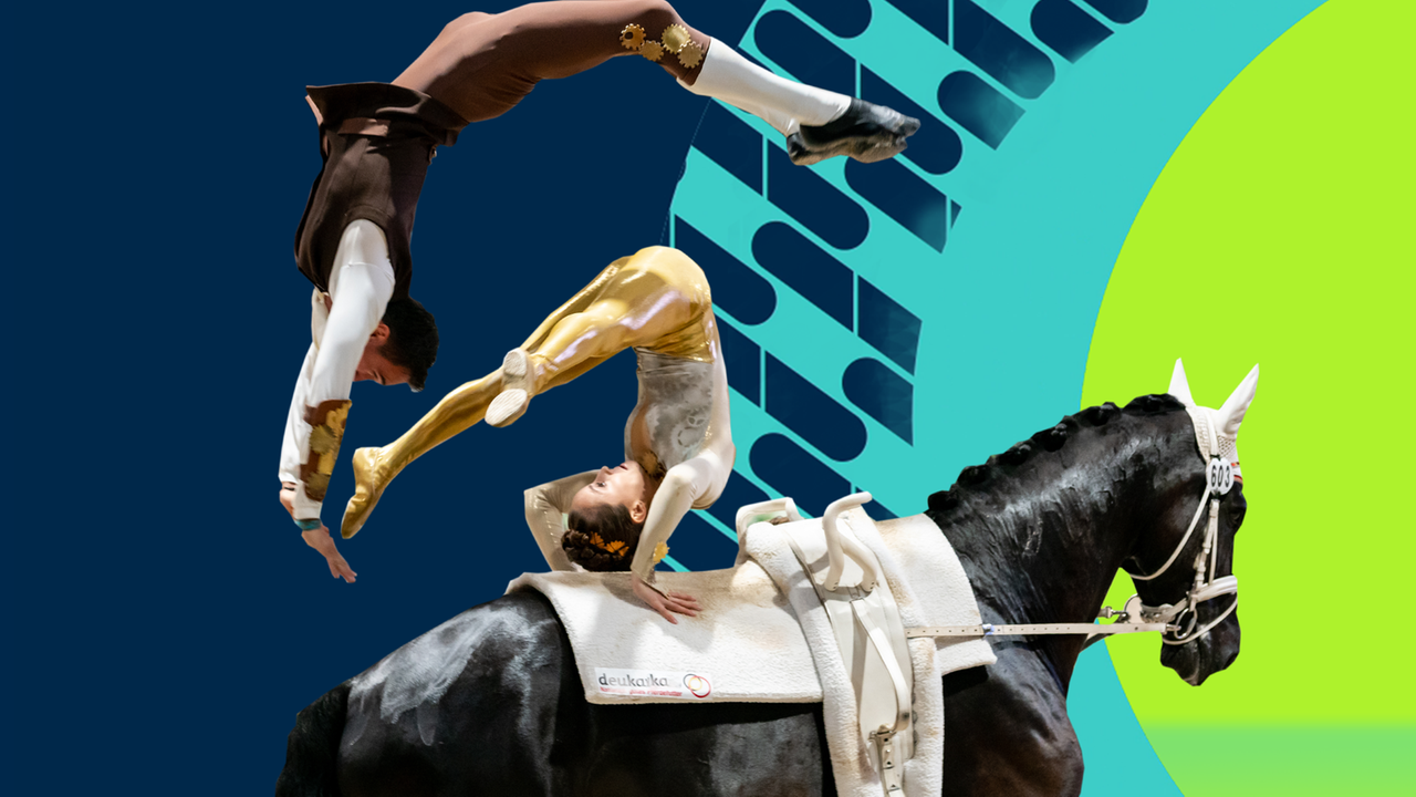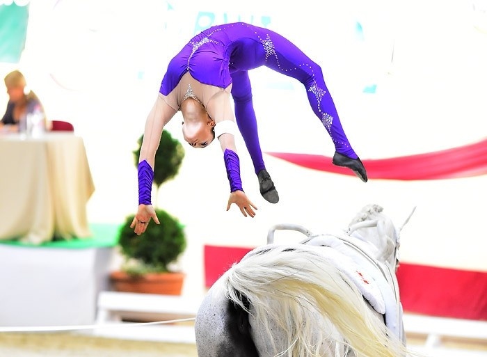 and acrobatic exercises on a horse, while it's moving along a lunge in