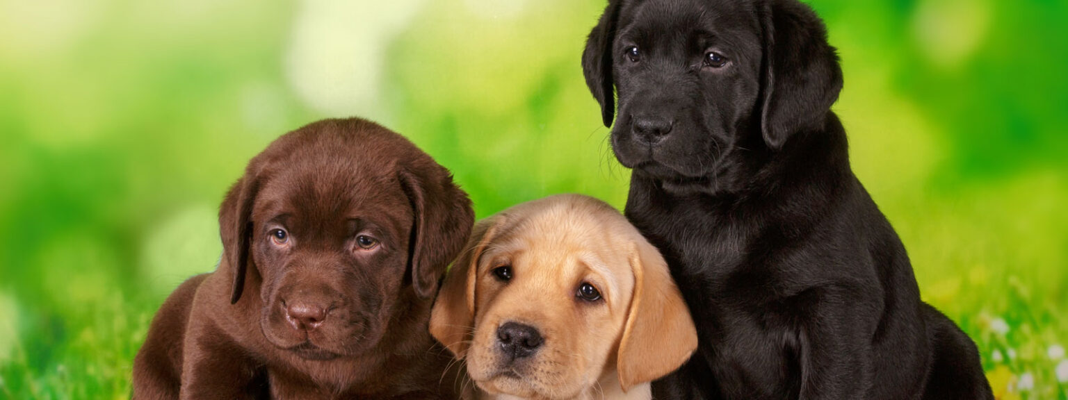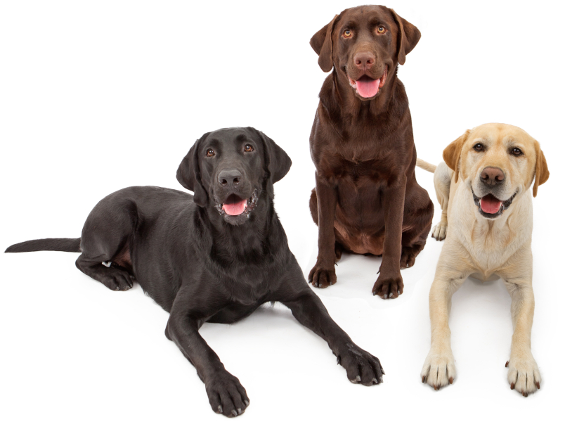 Labradors are registered in three colours: Solid black, yellow (anything from creamy white to fox-red), and chocolate (medium to dark brown; originally called "liver"). Puppies of all colours can occur in the same litter. Coat colour is determined primarily by three genes, called MC1R, Agouti, and CBD103.