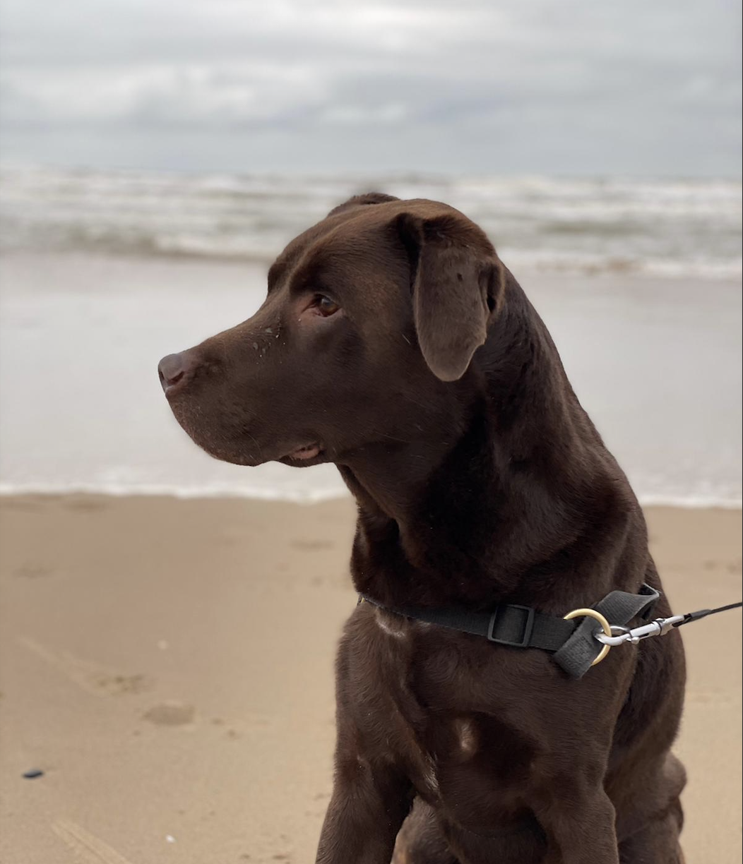 2. Dino is a brown Labrador, also known as a Chocolate Labrador.