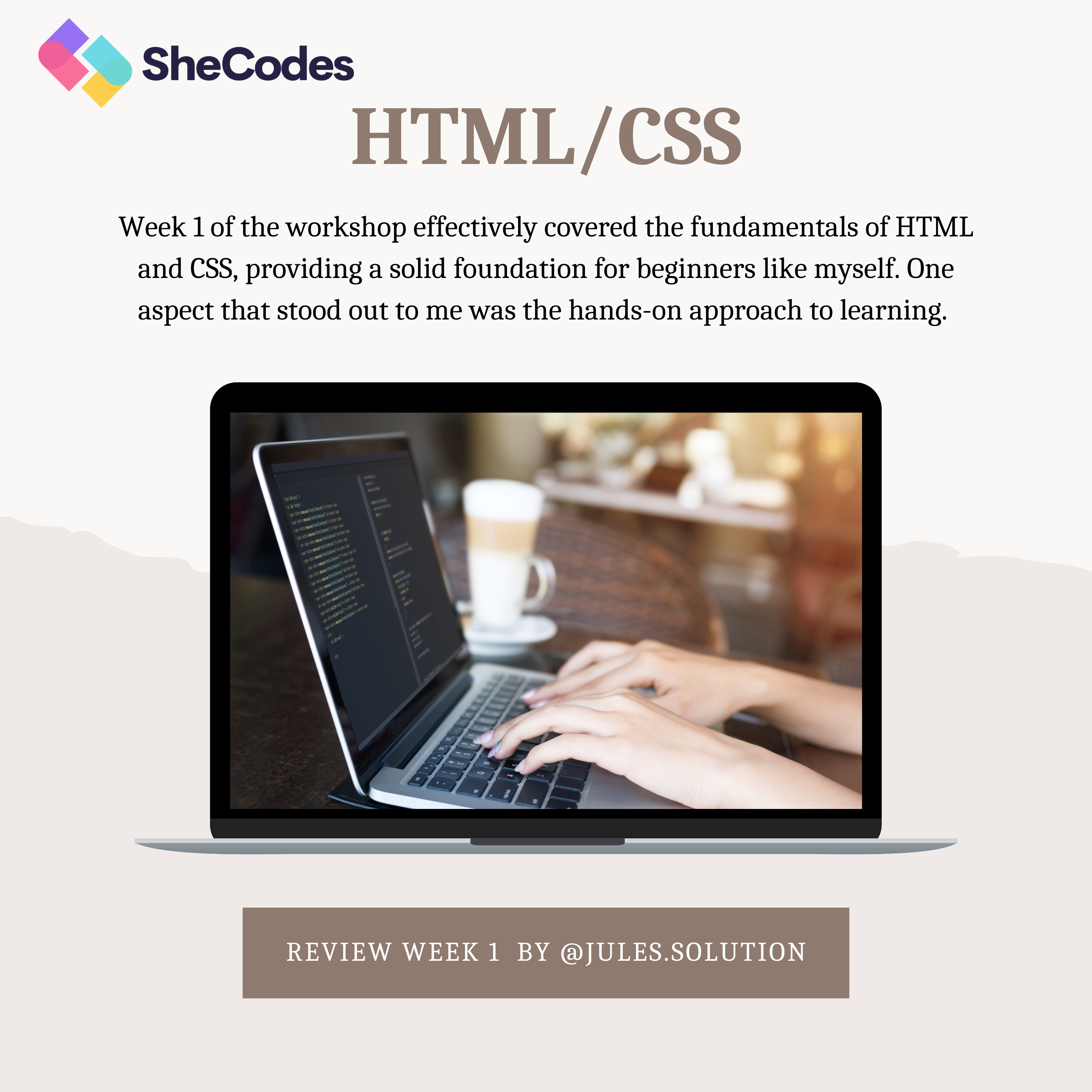 Overall, the SheCodes Basic Workshop's first week exceeded my expectations. I am now equipped with a solid understanding of HTML and CSS basics.