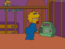 Margaret Evelyn Lenny "Maggie" Simpson is often seen sucking on her orange pacifier and, when she walks, she trips over her clothing