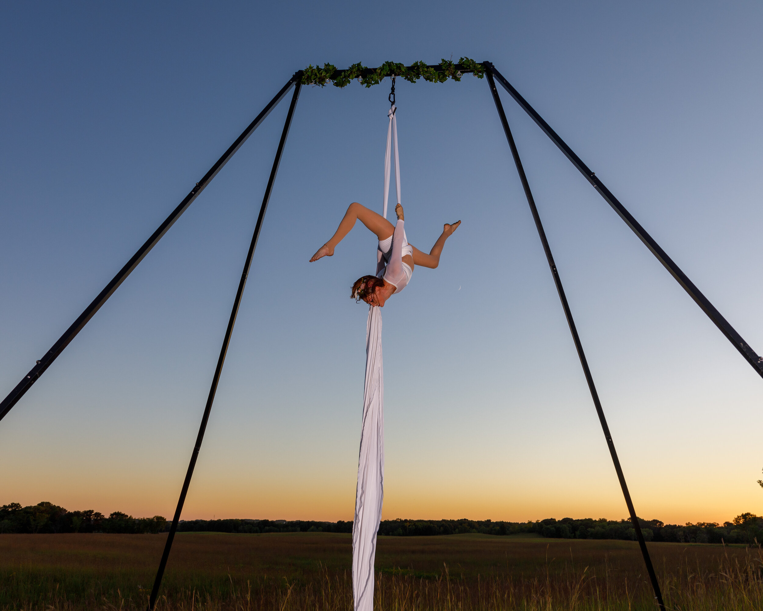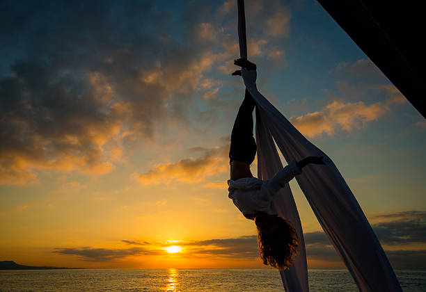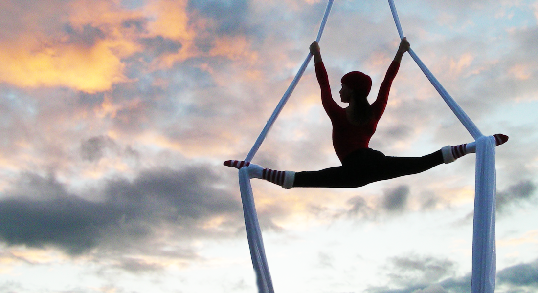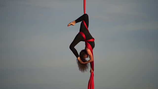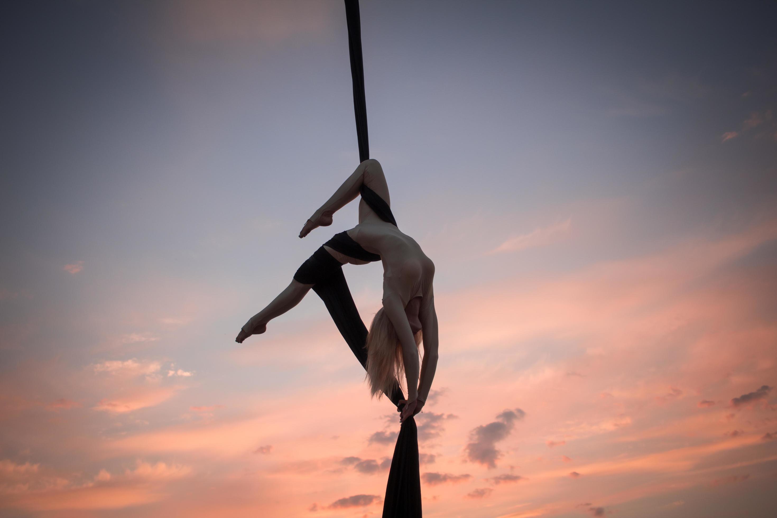 Aerial silks is a type of performance in which one or more artists perform aerial acrobatics while hanging from a specialist fabric. The fabric may be hung as two pieces, or a single piece, folded to make a loop, classified as hammock silks.