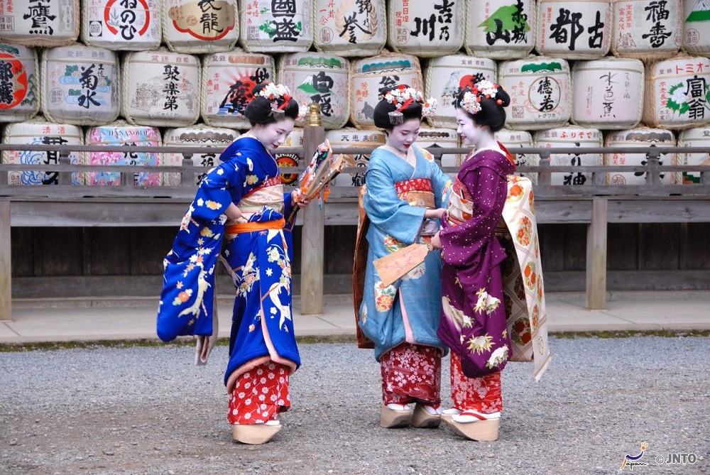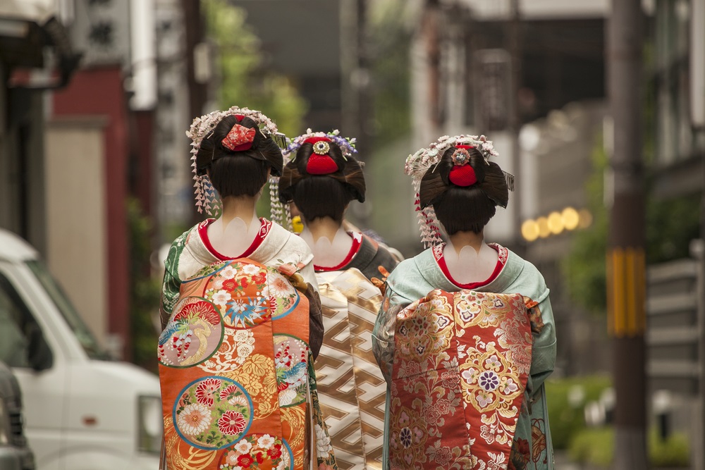 A Maiko, also called Hangyoku (meaning โhalf-jewelโ), is an apprentice Geisha. Like Geisha, they perform various arts such as odori (traditional Japanese dances), the Shamisen or the Koto (traditional Japanese instruments) for visitors during feasts. A maiko's training typically starts at the age of 15 or 16 and they don't become a geiko until they have completed 5-years of training and are at least 20 years old. Maiko go to a special school for their training to learn about traditional Japanese culture and entertainment. In order to enter the geisha schools, the girls need to pass an introductory exam and training session. Only the most talented go on to train as maiko. Even though they are in training, maiko are already professionals and go to events and dinners as entertainers. Both, maiko and geiko, often attend events together and live together in special houses called okiya, in the geisha districts of Kyoto. It is easy to tell the difference between a maiko and geiko if you know what to look for. Maiko often wear kimonos with long sleeves, while geiko typically wear kimonos with shorter sleeves. Geiko often wear wigs without any decorations, whereas maiko have their natural hair styled very elaborately with beautiful hairpins.
