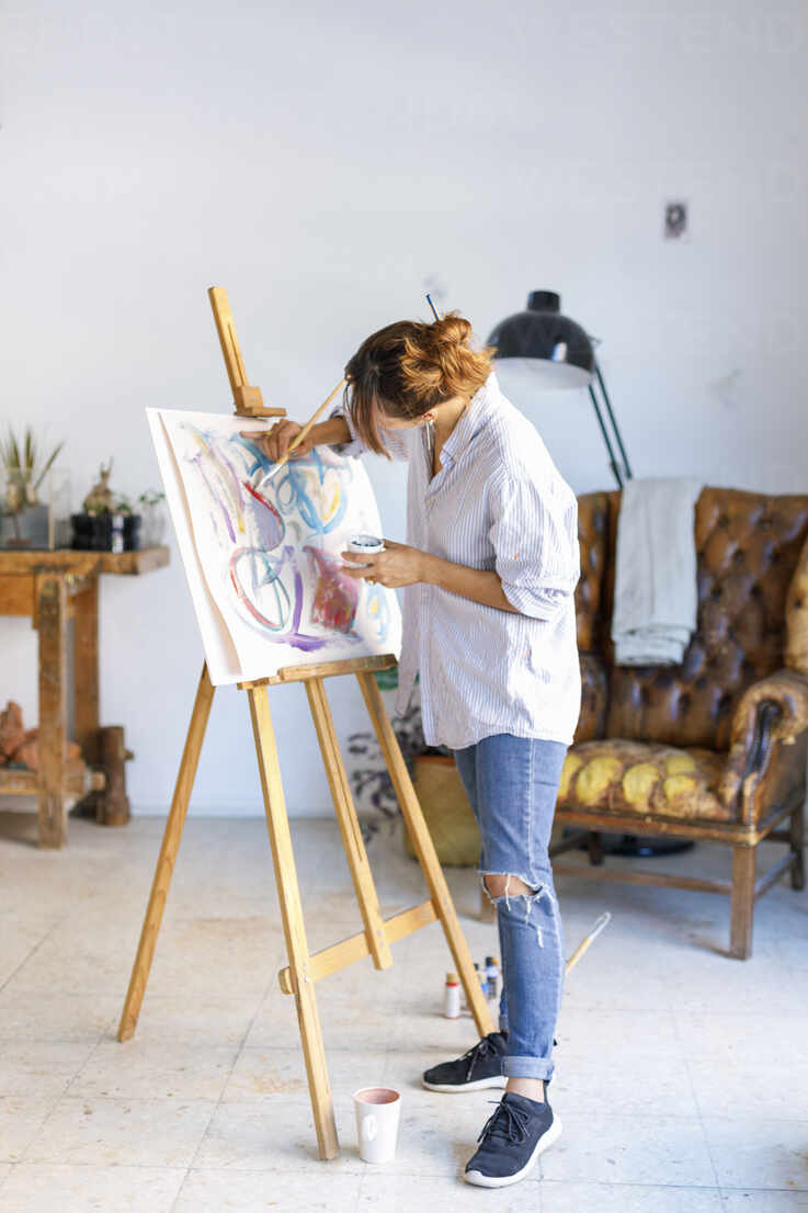 Painting is a visual art, which is characterized by the practice of applying paint, pigment, color or other medium to a solid surface (called the "matrix" or "support"). The medium is commonly applied to the base with a brush, but other implements, such as knives, sponges, and airbrushes, can be used.
