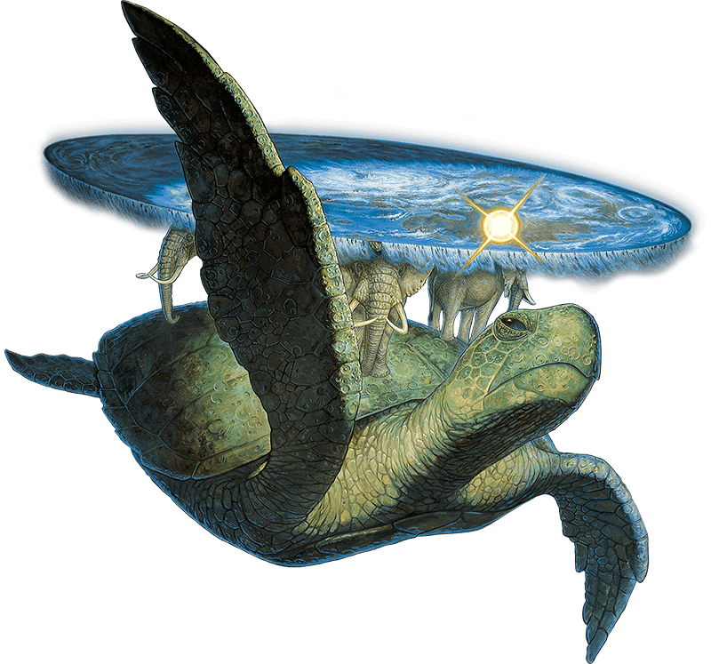 planet balanced on the backs of four elephants which in turn stand on the back of a giant turtle.