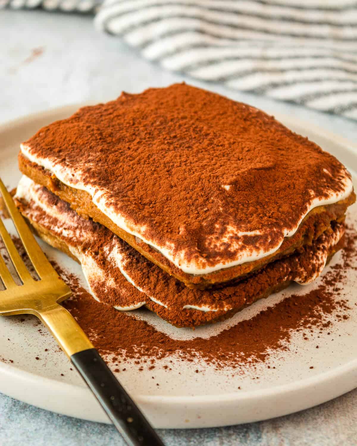 biscuits (savoiardi) dipped in coffee, layered with a whipped