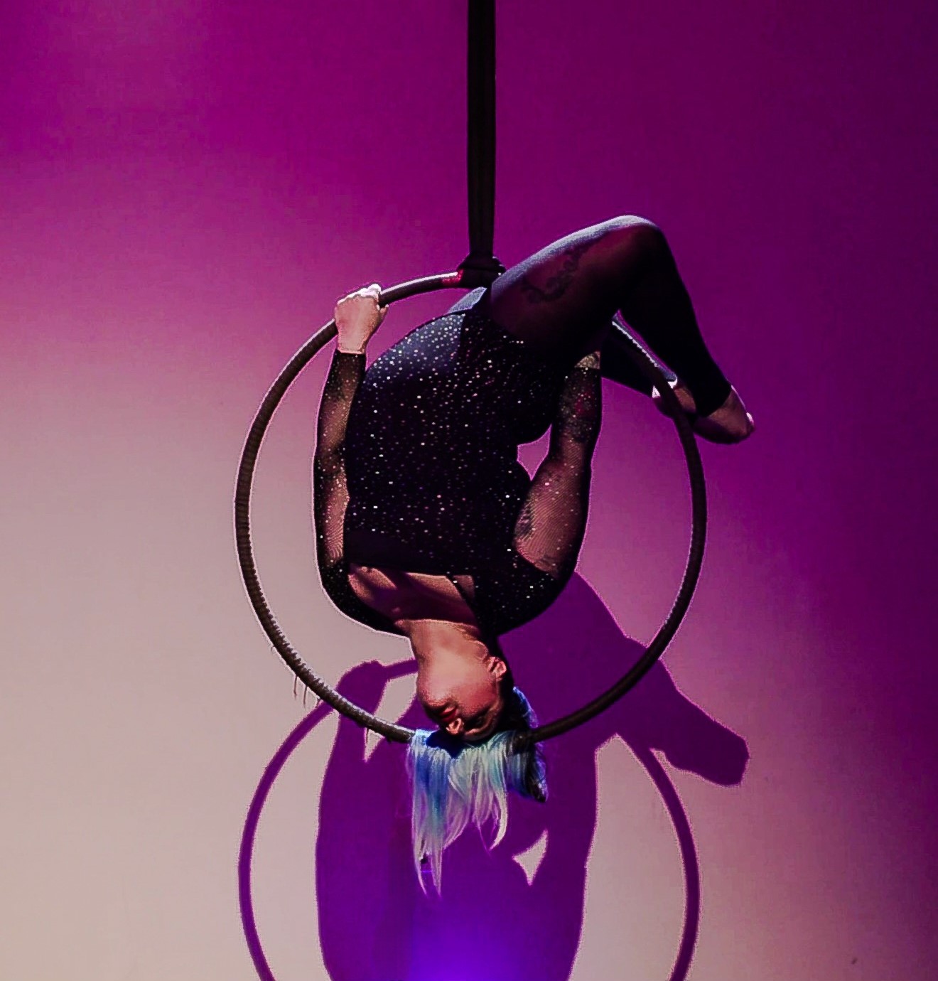 Aerial arts refers to physical disciplines involving the use of apparatuses that hang down from a rig point. Some of the most common are Aerial Fabric (commonly called Aerial Silks even though they are not in fact made from silk), Aerial Hoop (also called Lyra or Cerceaux), Trapeze (static, swinging, flying, and dance trapeze), Aerial Rope (also called Corde Lisse), Straps, Loops, Slings, Hammocks, and a variety of other apparatuses of all shapes and sizes.