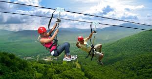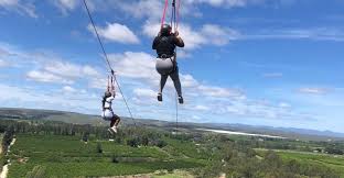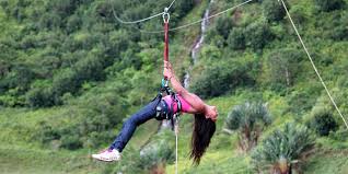A zip-line, zip line, zip-wire, flying fox, or death slide is a pulley suspended on a cable, usually made of stainless steel, mounted on a slope. Learn more on Wikipedia