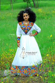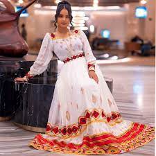 Ethiopian woman in Addis Ababa wears violet Habesha kemis. The ankle-length dress is usually worn by Ethiopian and Eritrean women at formal events, holidays, and invitations, and comes in many regional varieties. It is made of cotton fabric and typically comes in white, grey, or beige shades.In Ethiopia, the way of dressing is greatly influenced by several factors, majorly the climatic condition (which is greatly influenced by the landscape) and the culture of the people in a particular area. Even though there are still many people who think that all Ethiopians put on the typical snow-white attire, it is still difficult to point out a single traditional dress for all of Ethiopia. With that said, the Ethiopians generally wear the Habesha Kemis, which is the traditional dress of the Ethiopians. Cotton is the main material used in making this dress, giving it that unique and elegant appearance. Usually, the Habesha Kemis comes in white, light-brown, and gray colors.Traditionally, the dress runs down to the ankle and some shiny threads (known as tilet) are used to decorate the bottom of the dress and also around the middle. Nevertheless, when designing for men, the tilet is fixed at the collar and sleeves, not just at the bottom and around the middle. This gives the Habesha Kemis an astonishing appearance. Even though this attire originates from the northern parts of the country, each region has a slight modification to the dress. This dress is usually worn with netela, a scarf that is typically lighter and thinner than the dress. In order to make it complement any other outfit, the netela is crafted in bright colors.