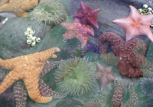 At the water's edge is the intertidal zone, a habitat that alternates between the dry and wet worlds. Tidepools occur where boulders and rocky outcrops trap seawater when the tide recedes. At high tide, they form surge channels, crevices and cracks that are home to many familiar seashore animals, like sea stars, hermit crabs, and sea anemones.