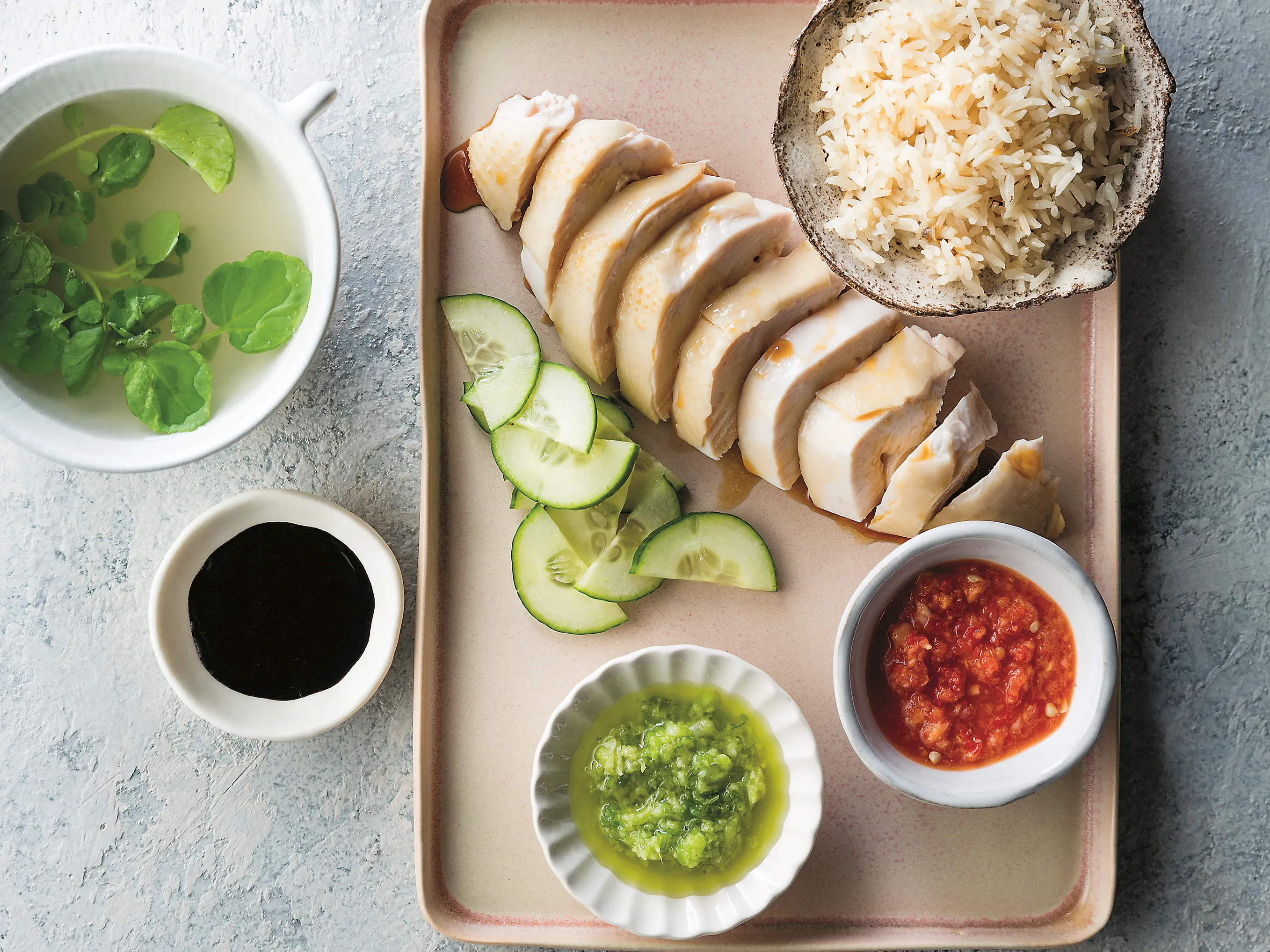 Hainanese Chicken Rice is usually represented by steamed chicken. However, roasted chicken is also an option for those who havenโt quite acquired the taste of traditionally steamed Chinese chicken yet. Some have found it to be a tad bland thus opting for the latter. Apart from the chicken, a typical plate of chicken rice consists of rice that has been cooked in chicken broth, chilli sauce made up of garlic, ginger, chicken broth and ground chilli and a bowl of chicken soup garnished with spring onions and white pepper.