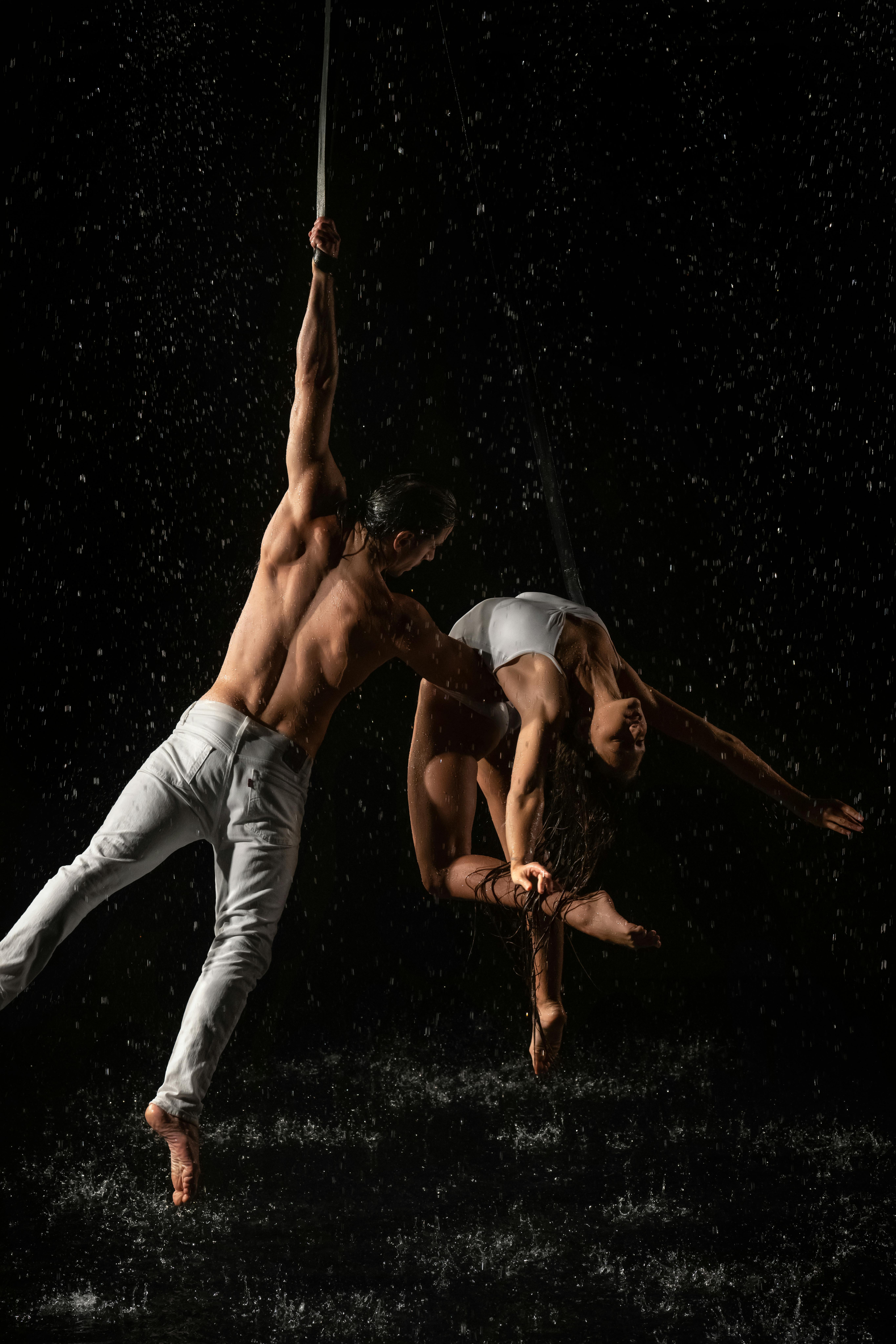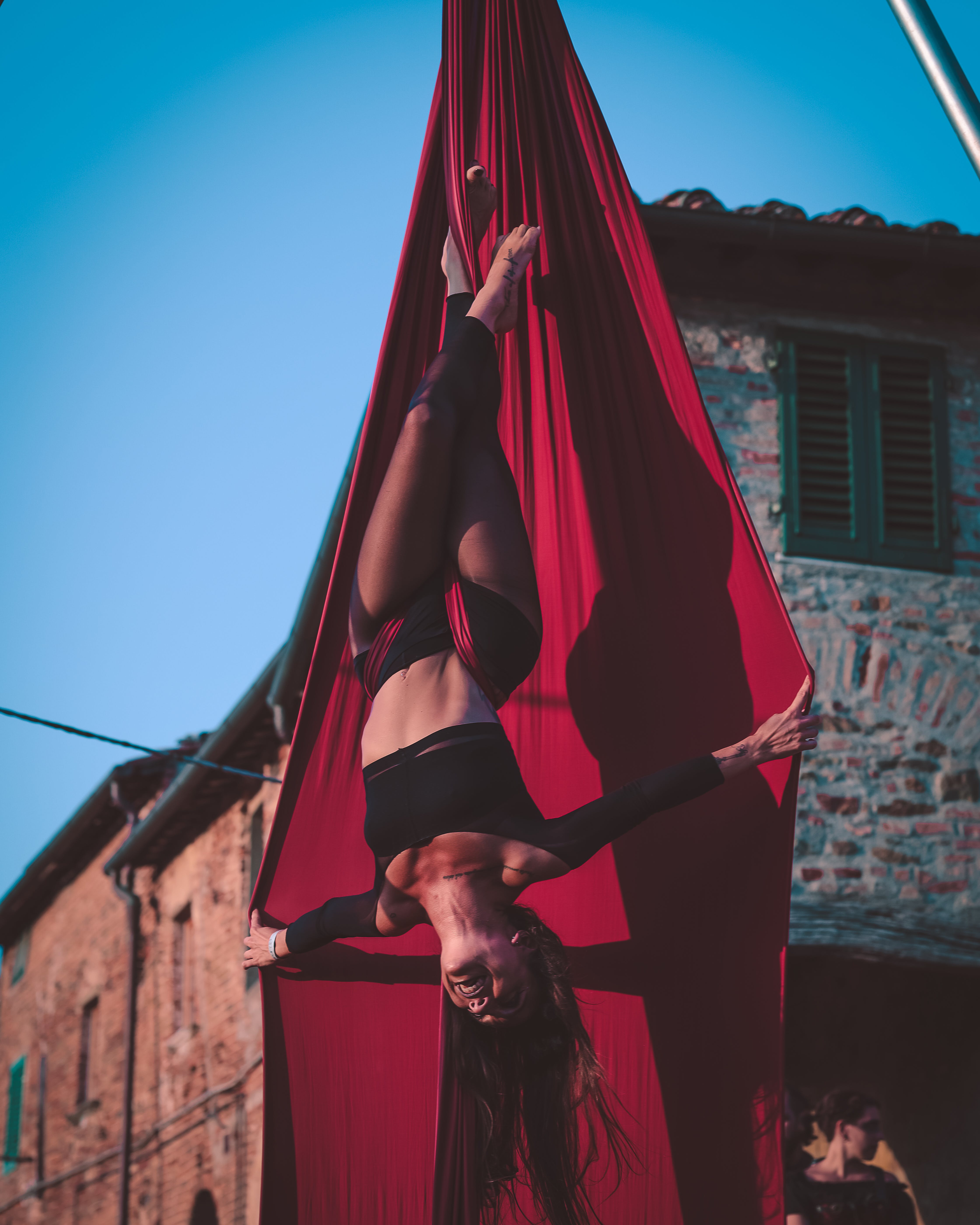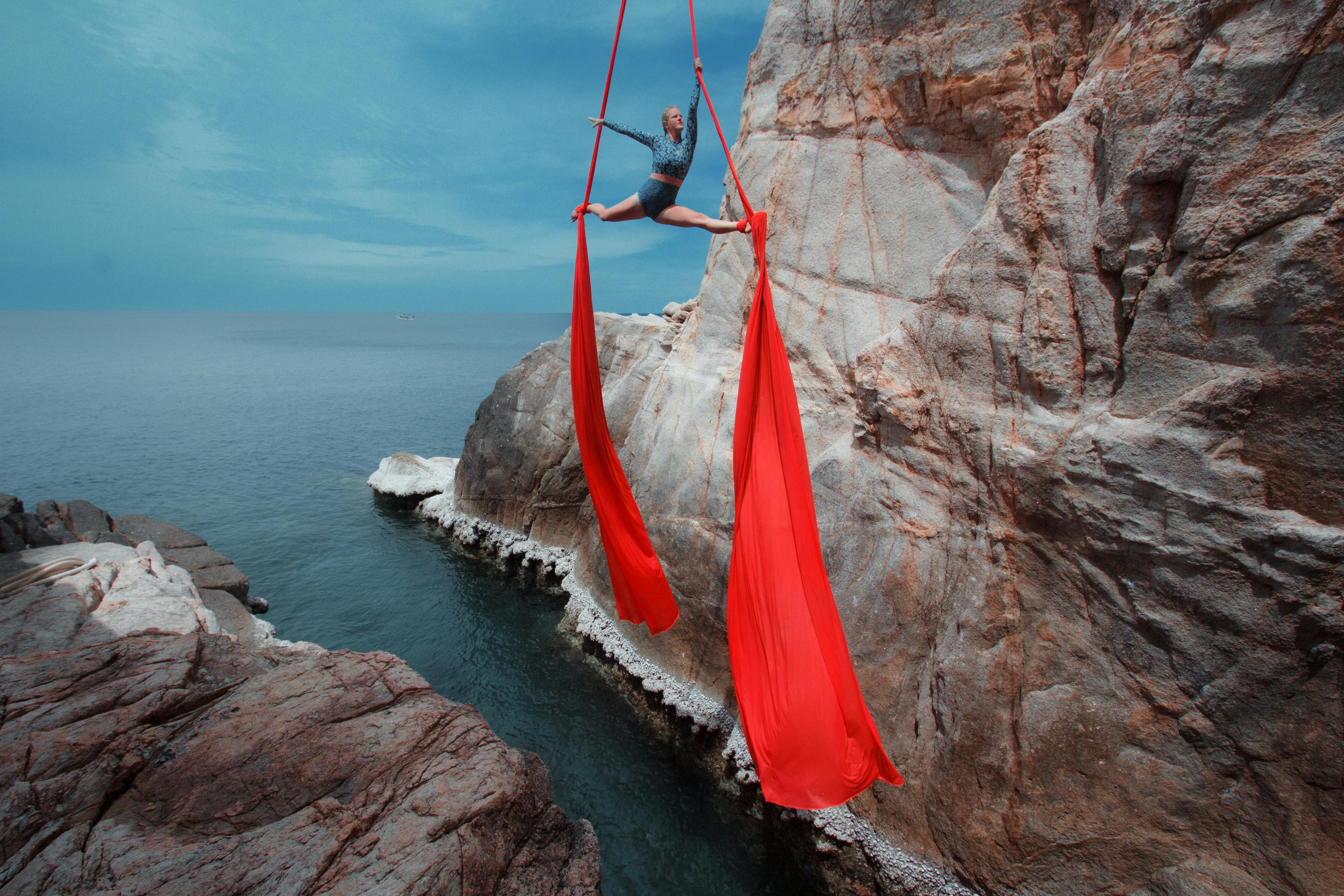 Aerial silks (also known as aerial contortion, aerial ribbons, aerial tissues, fabric, ribbon, or tissu) is a type of performance in which one or more artists perform aerial acrobatics while hanging from a specialist fabric. Performers climb the suspended fabric without the use of safety lines and rely only on their training and skill to ensure safety. They use the fabric to wrap, suspend, drop, swing, and spiral their bodies into and out of various positions. The fabric may also be used to fly through the air, striking poses and figures.