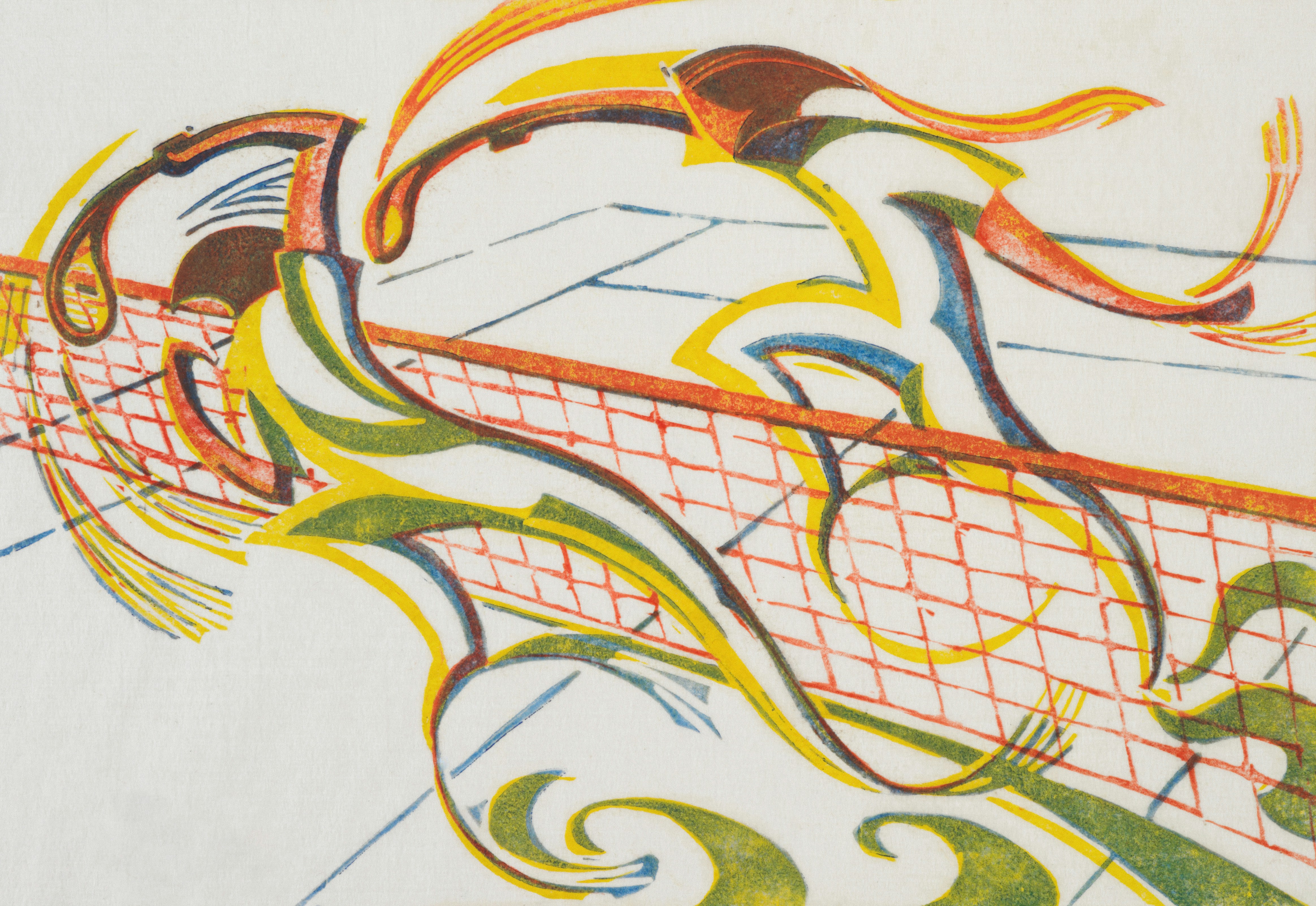 Linocut, also known as lino print, lino printing or linoleum art, is a printmaking technique, a variant of woodcut in which a sheet of linoleum (sometimes mounted on a wooden block) is used for a relief surface. A design is cut into the linoleum surface with a sharp knife, V-shaped chisel or gouge, with the raised (uncarved) areas representing a reversal (mirror image) of the parts to show printed. The linoleum sheet is inked with a roller (called a brayer), and then impressed onto paper or fabric. The actual printing can be done by hand or with a printing press.