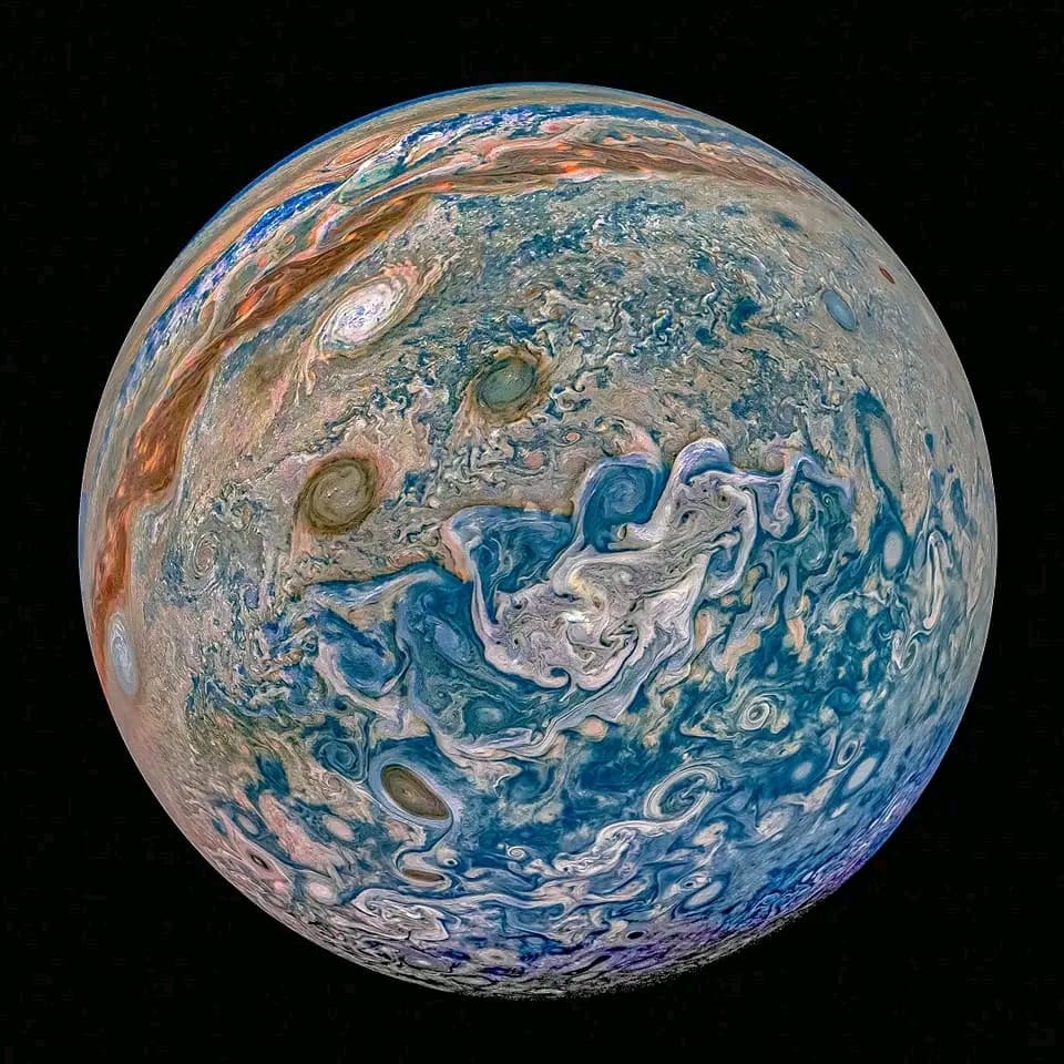 Jupiter's atmosphere is characterized by swirling clouds and bands of